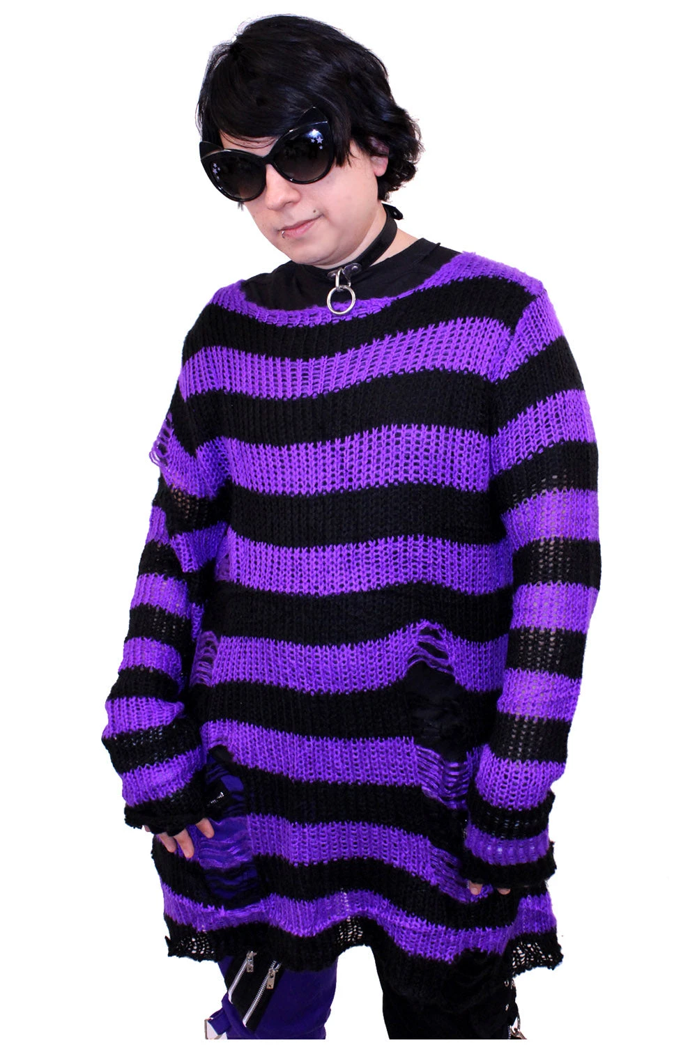 Haunt the night in your black and purple striped sweater! Conjure creatures of the night in the statement emo stripes, complete with distressed details and cozy knit construct. Wrap up in the exxtra long sleeves + length for exxtra dark drama.Â