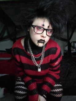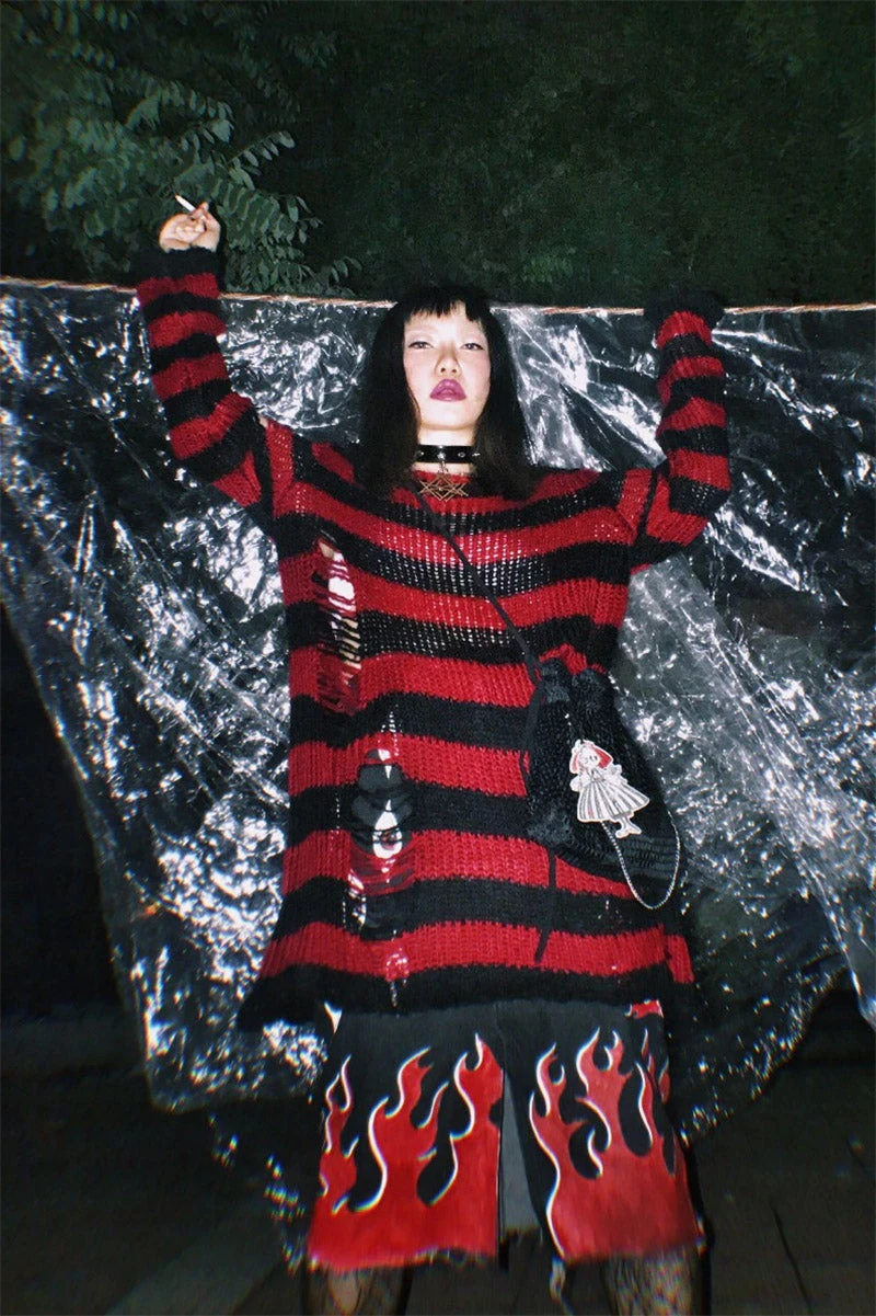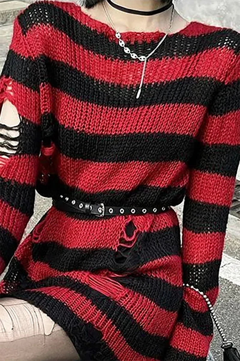 You break hearts in your blood-red striped sweater! Conjure some vampire vibez in the statement emo stripes, complete with distressed details and cozy knit construct. Wrap up in the exxtra long sleeves + length for exxtra drama.Â