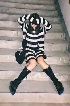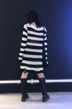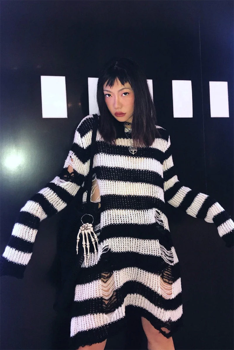 Channel some emo feelz in this black and white striped sweater. Contrasting striped body with extra long length for extra cozy creeps. With distressed detailing and low neckline, perfect for midnight promenades with the moon and hungover Sundays.