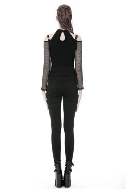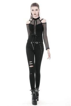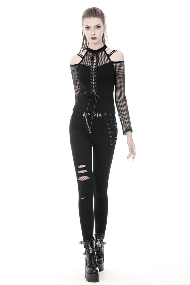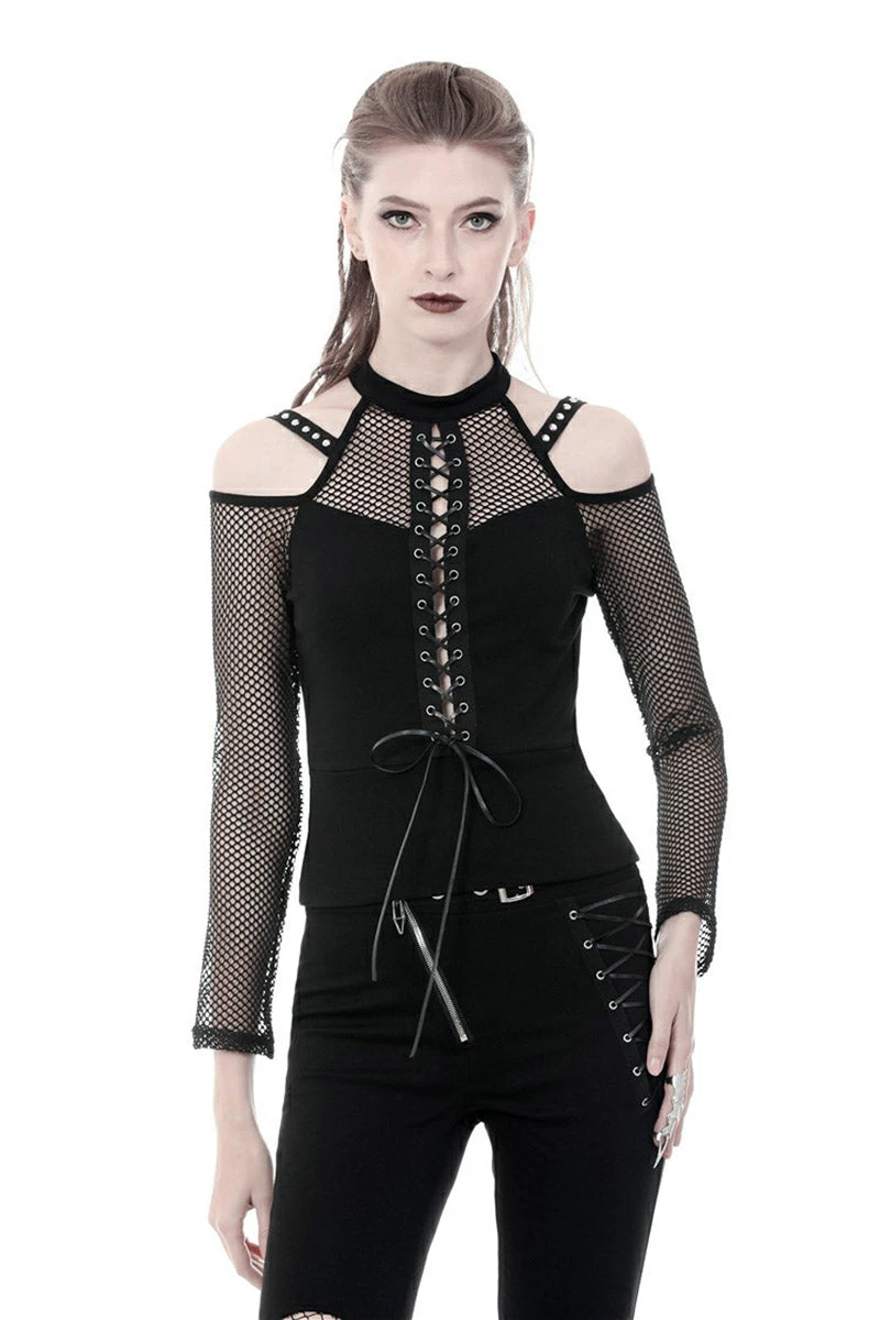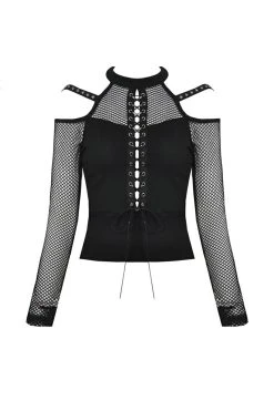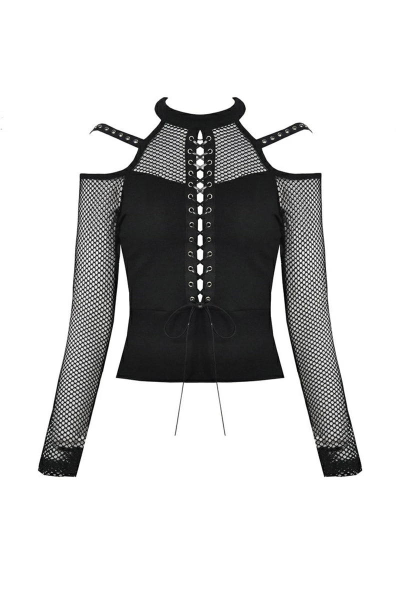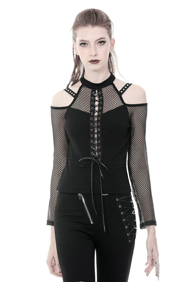 Lead the legions in this fierce fishnet top! You’re dark as you are deadly in the plunging corset design, designed to please and leave ‘em wanting more. Give haters the cold shoulder in the statement shoulder cutouts, romanced with accents straps and silver eyelets. Pair this fishnet top with skinny jeans and combat boots, and their hearts will be yours to command…