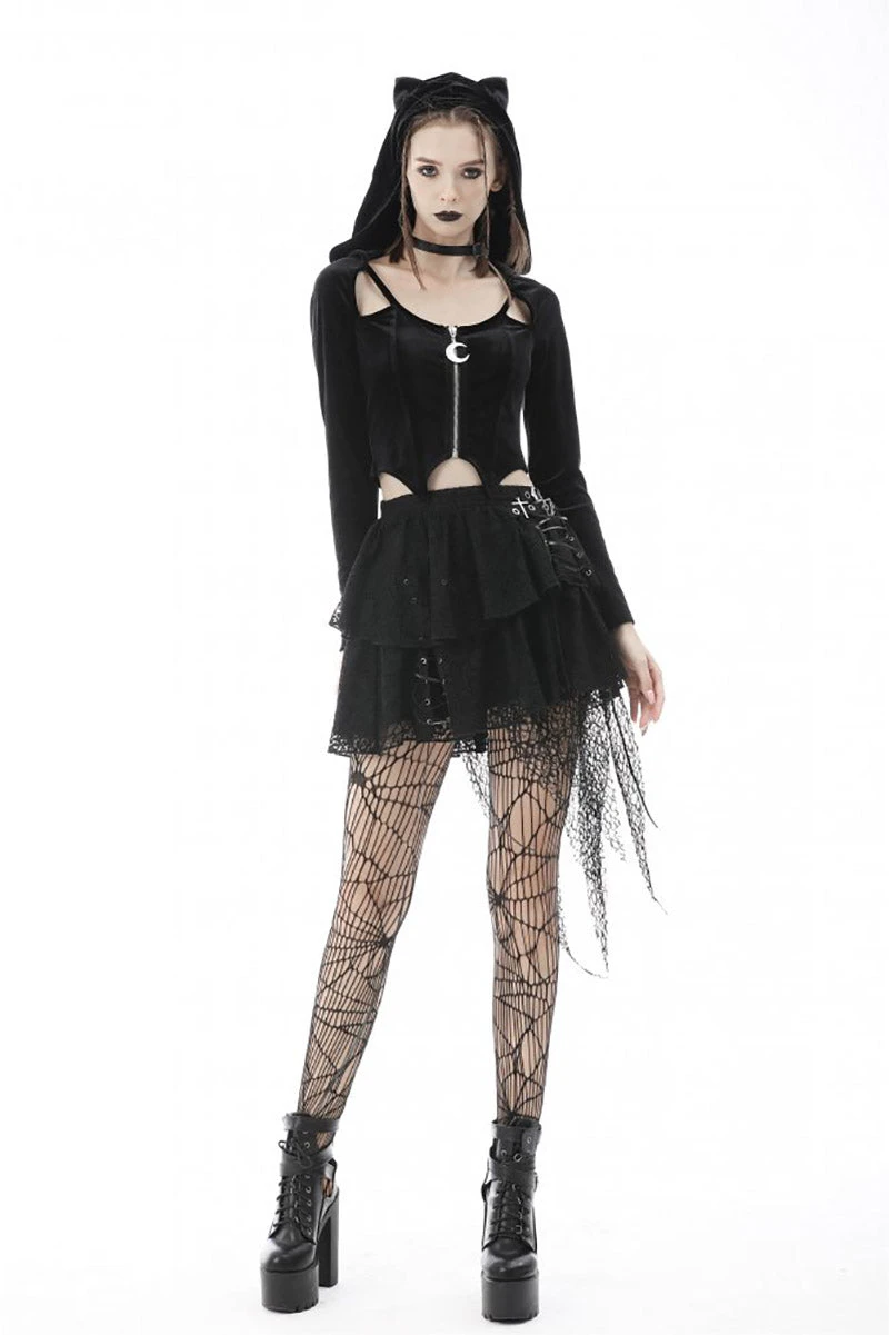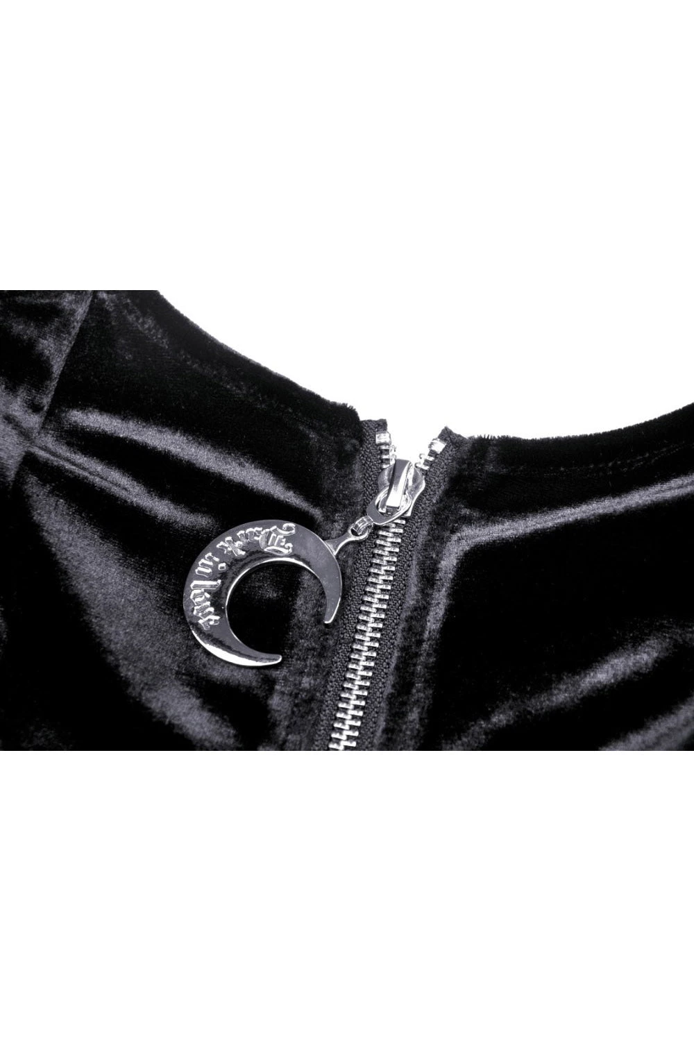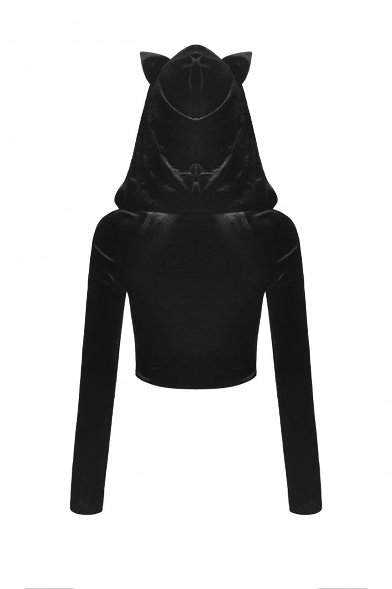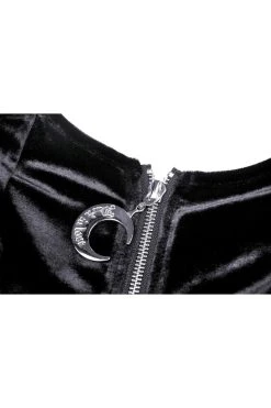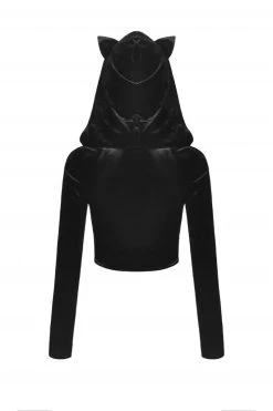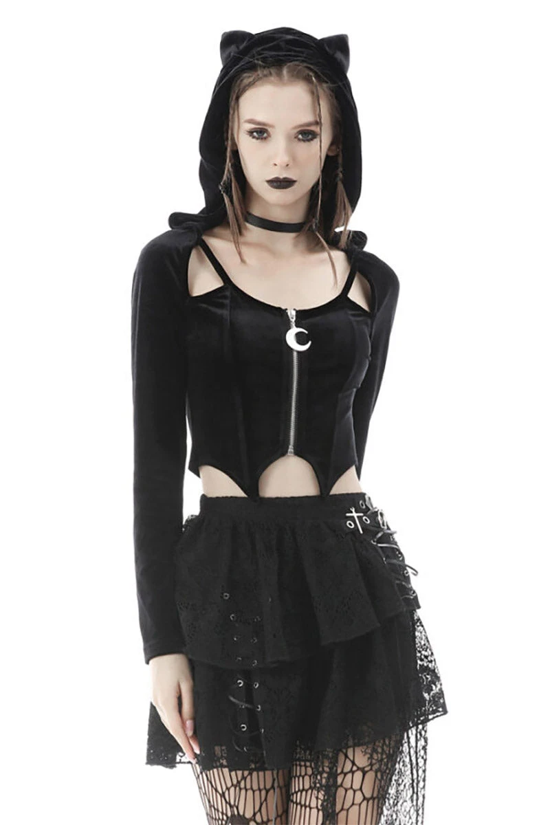 Catnap in spooky style in this creepy cute hooded top! Made of black velvet, this gothic crop top features kitty ears attached to the statement hood. Bewitching keyhole details haunt the front, complete with a silver zipper front closure. Keep it witchy in the irregular hem. Finished with a silver crescent moon charm on the zipper pull!
