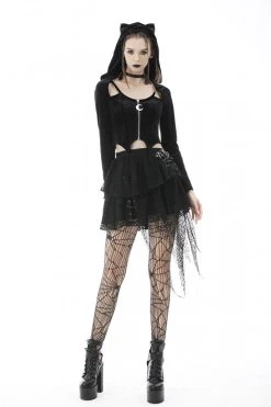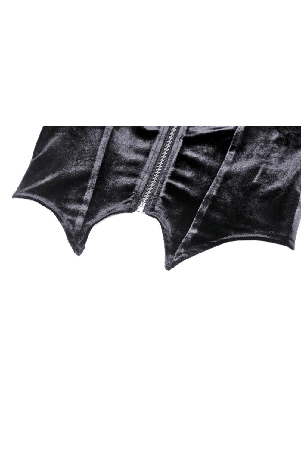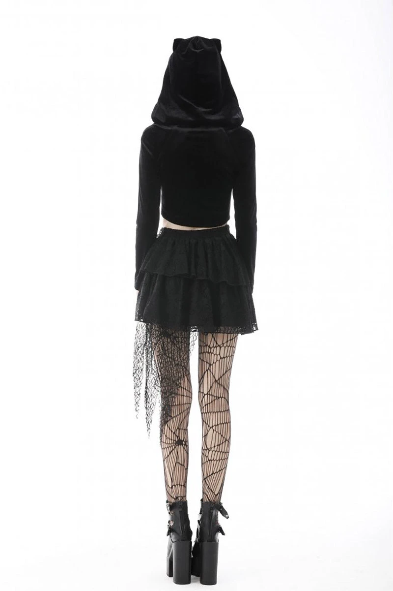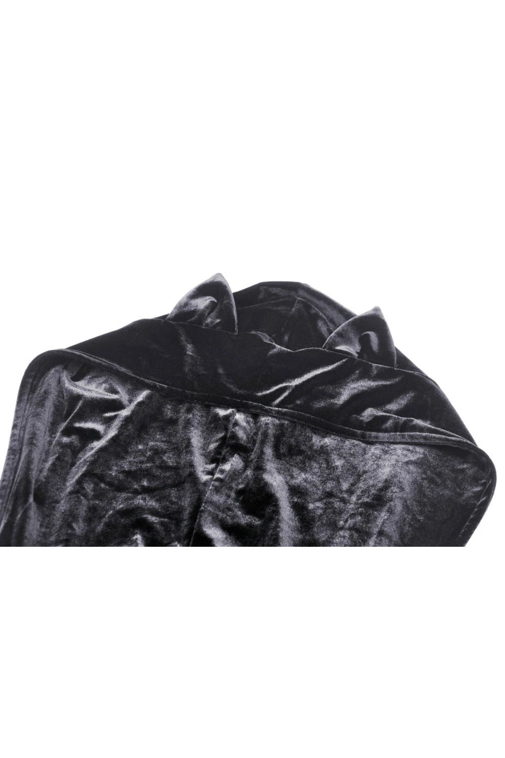 Catnap in spooky style in this creepy cute hooded top! Made of black velvet, this gothic crop top features kitty ears attached to the statement hood. Bewitching keyhole details haunt the front, complete with a silver zipper front closure. Keep it witchy in the irregular hem. Finished with a silver crescent moon charm on the zipper pull!
