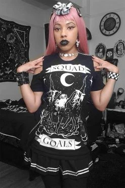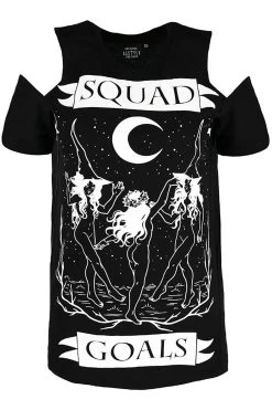 Reach your spooky squad goals in this spellbinding tee! Get cozy in the oversized fit, charmed with a witchy black and white design. Give ’em the cold shoulder in the cute shoulder cut-outs and Squad Goals lettering. Wear it to your next coven meet as a shirt or dress… whatever your wiccan heart desires.Â