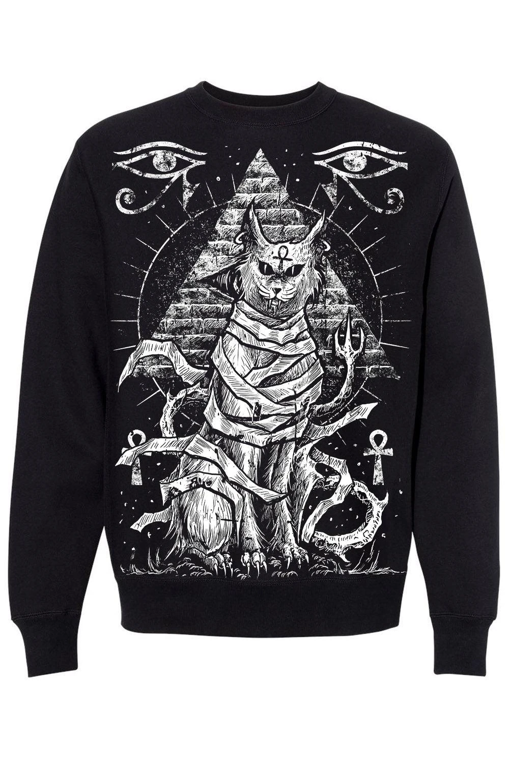Invoke the Egyptian gods of old wearing this occult Bastet sweatshirt! Let the goth goddess of secrets, home, and creepy cats protect your path in the heavy metal design, featuring Bastet bound in mummy wrappings. A pyramid looms in the background—Ankh symbols and ancient eyes haunt the night sky to guide you through the darkness. Handprinted on high-quality, killer cozy sweatshirts.