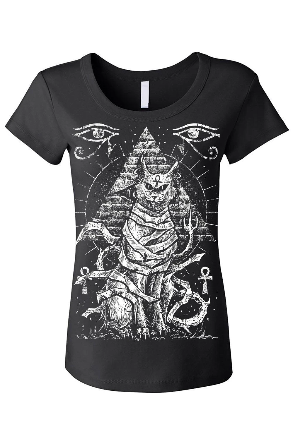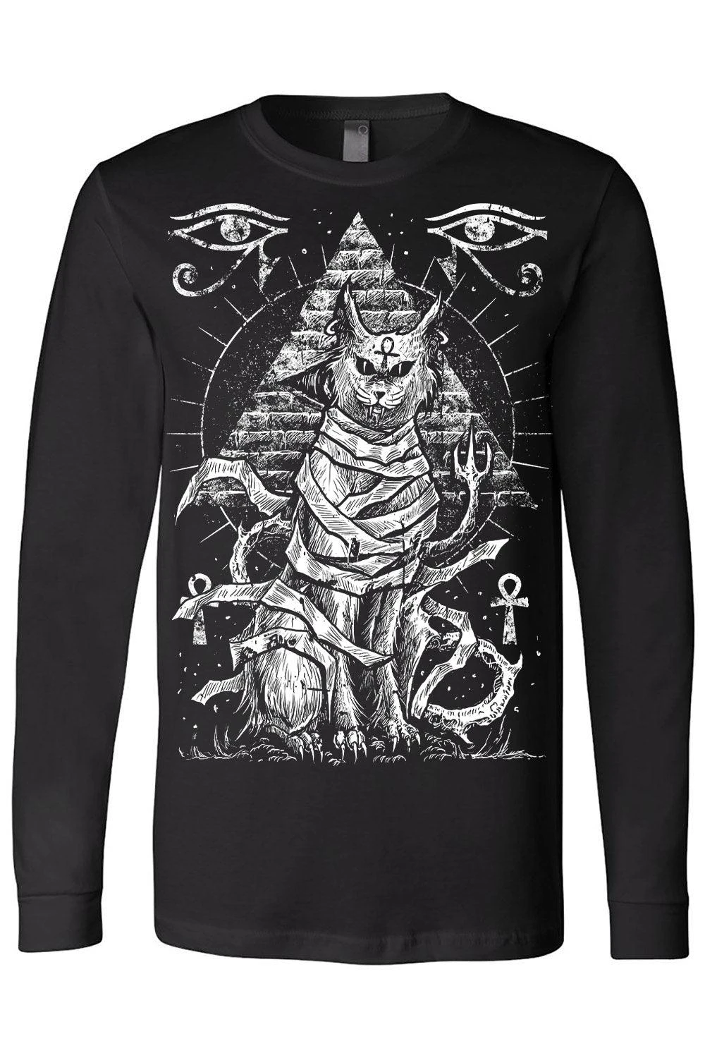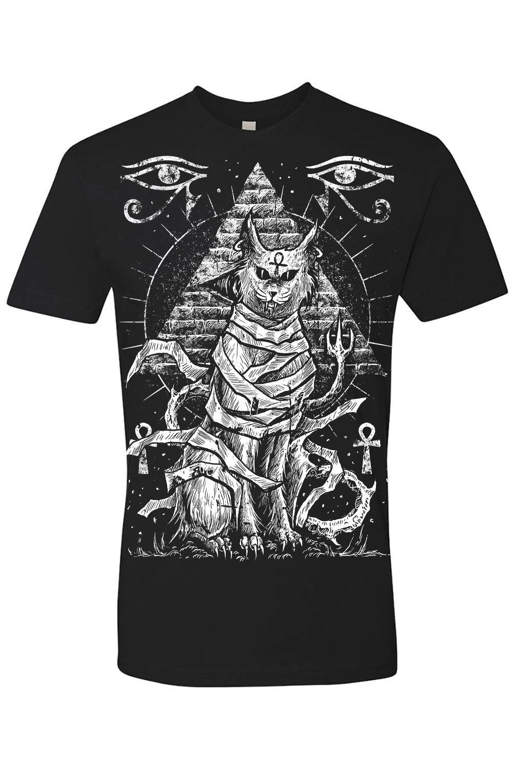 Invoke the Egyptian gods of old wearing this occult Bastet tee! Let the goth goddess of secrets, home, and creepy cats protect your path in the heavy metal design, featuring Bastet bound in mummy wrappings. A pyramid looms in the background—Ankh symbols and ancient eyes haunt the night sky to guide you through the darkness. Handprinted on high-quality, killer cozy tees.