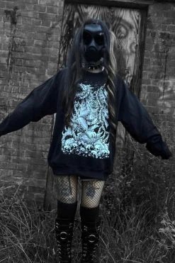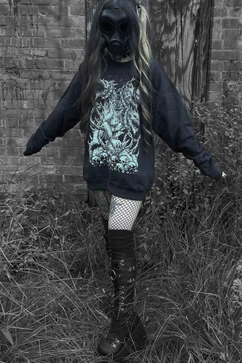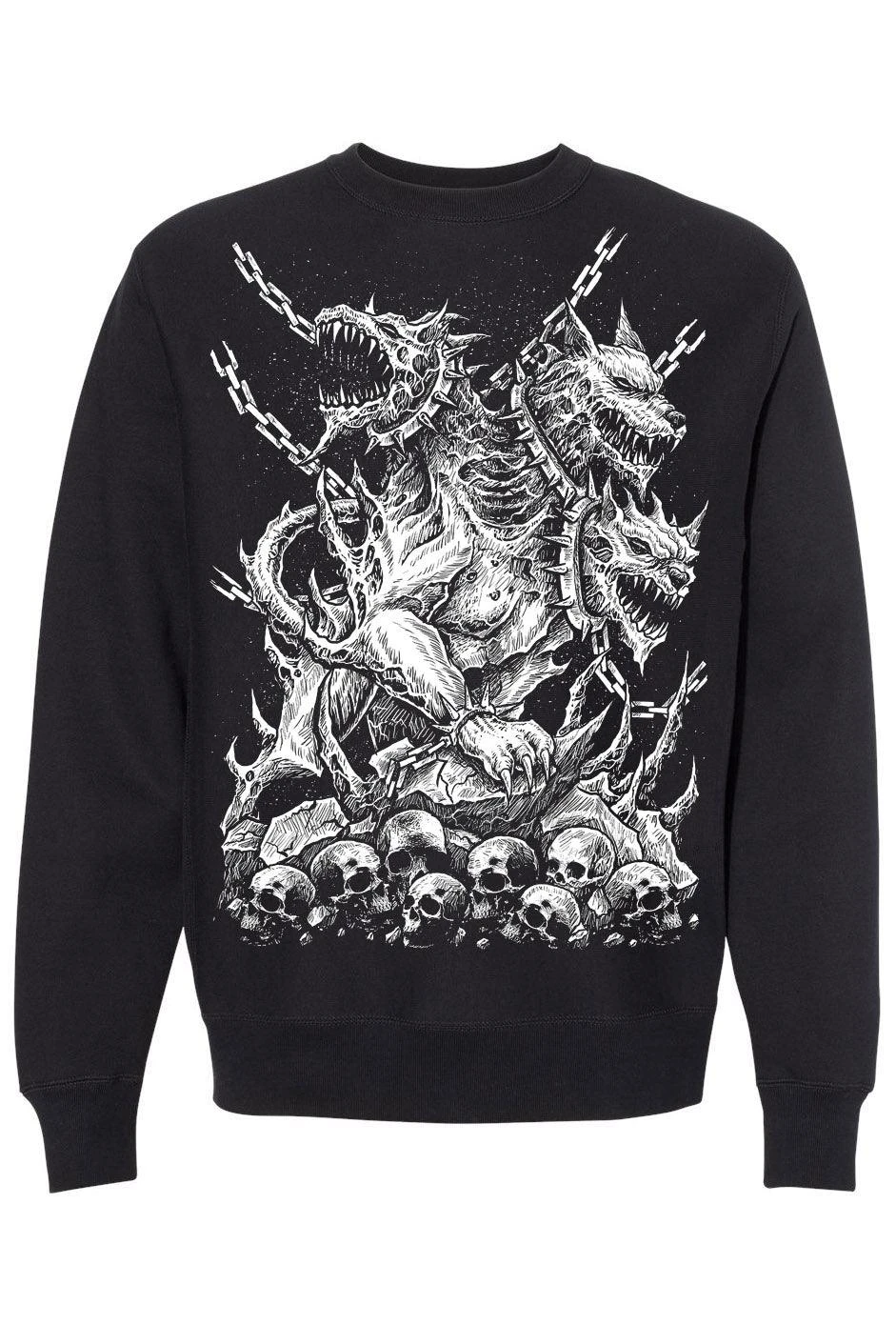 Command the hounds of hell in this epic Cerberus sweatshirt! Guard your heathen heart with the three-headed dogs of Hades, confined in chains above a grave of human skulls. Sinfully soft, this gothic sweatshirt is spun from a quality cotton blend designed to keep you comfy & creepy when you take your goth dog for a walk.