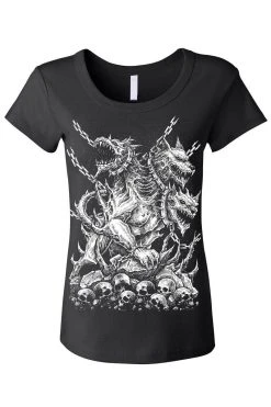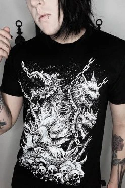 Command the hounds of hell in this epic Cerberus tee! Guard your heathen heart with the three-headed dogs of Hades, confined in chains above a grave of human skulls. Sinfully soft, this gothic shirt is spun from a quality cotton blend designed to keep you comfy & creepy when you take your goth dog for a walk.Â