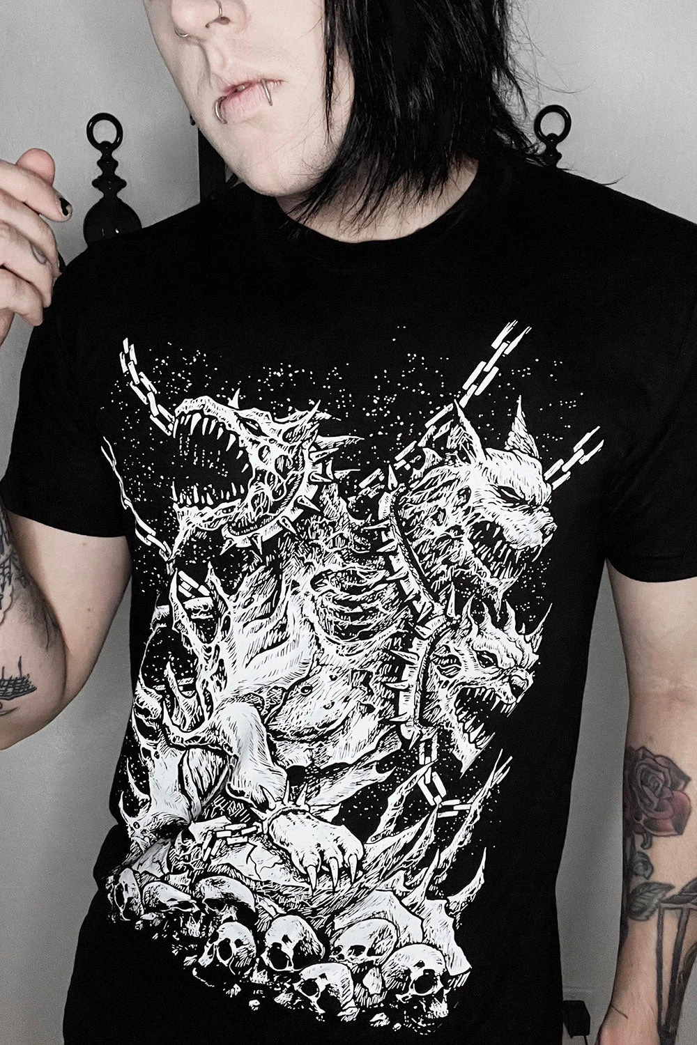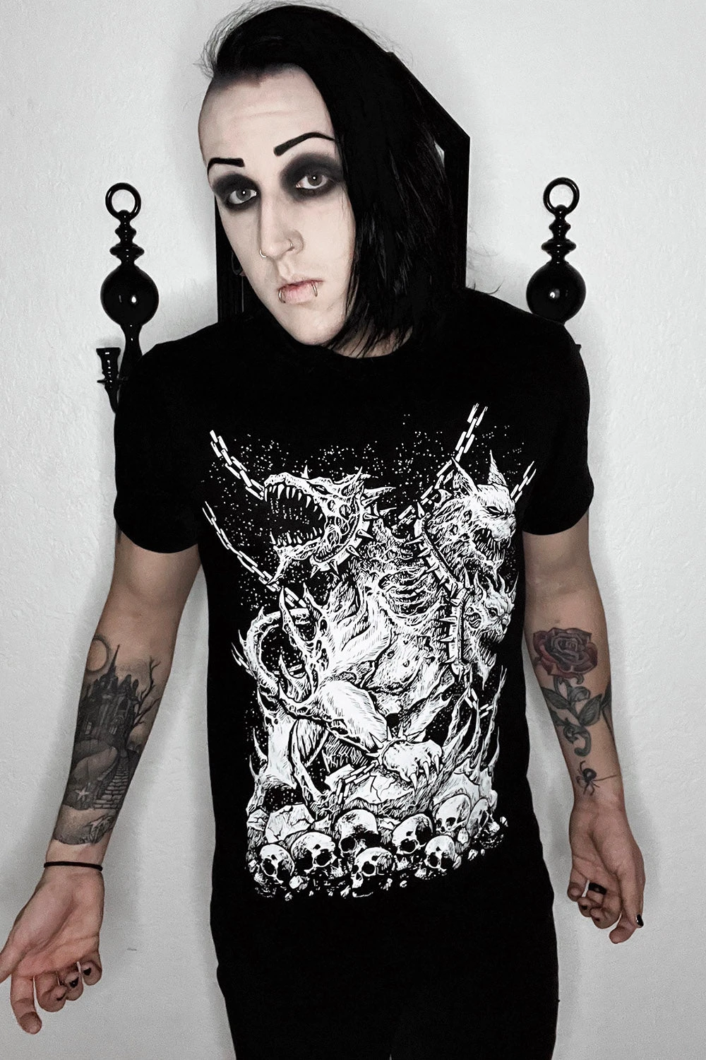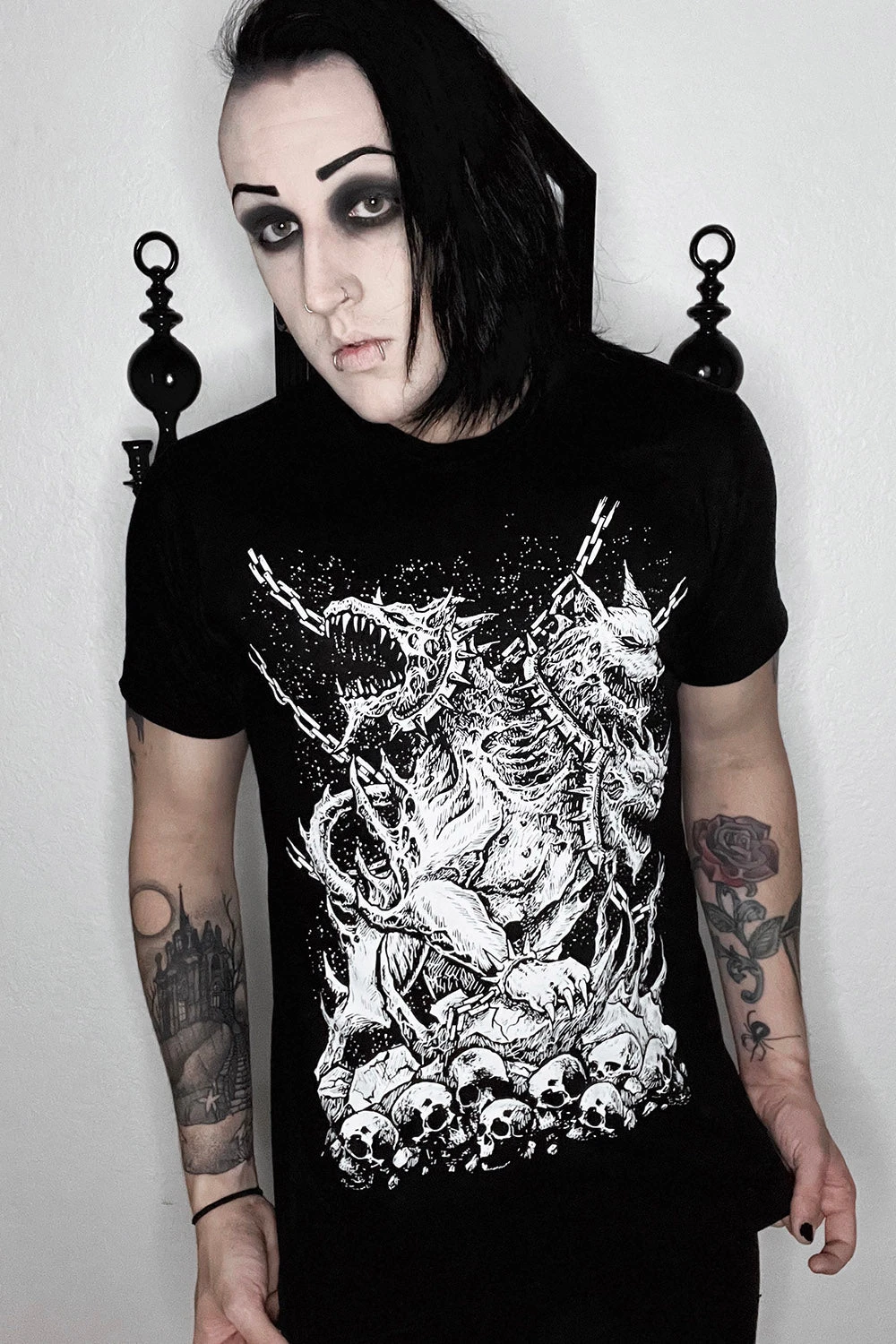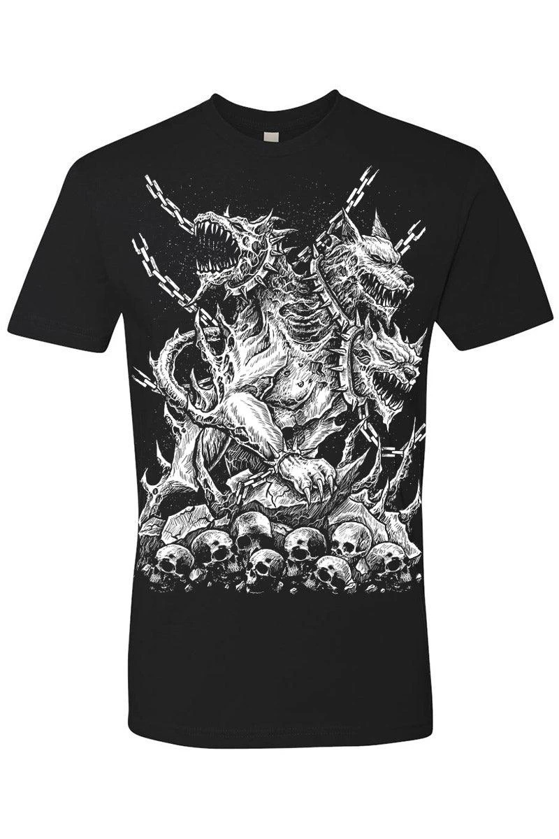 Command the hounds of hell in this epic Cerberus tee! Guard your heathen heart with the three-headed dogs of Hades, confined in chains above a grave of human skulls. Sinfully soft, this gothic shirt is spun from a quality cotton blend designed to keep you comfy & creepy when you take your goth dog for a walk.Â