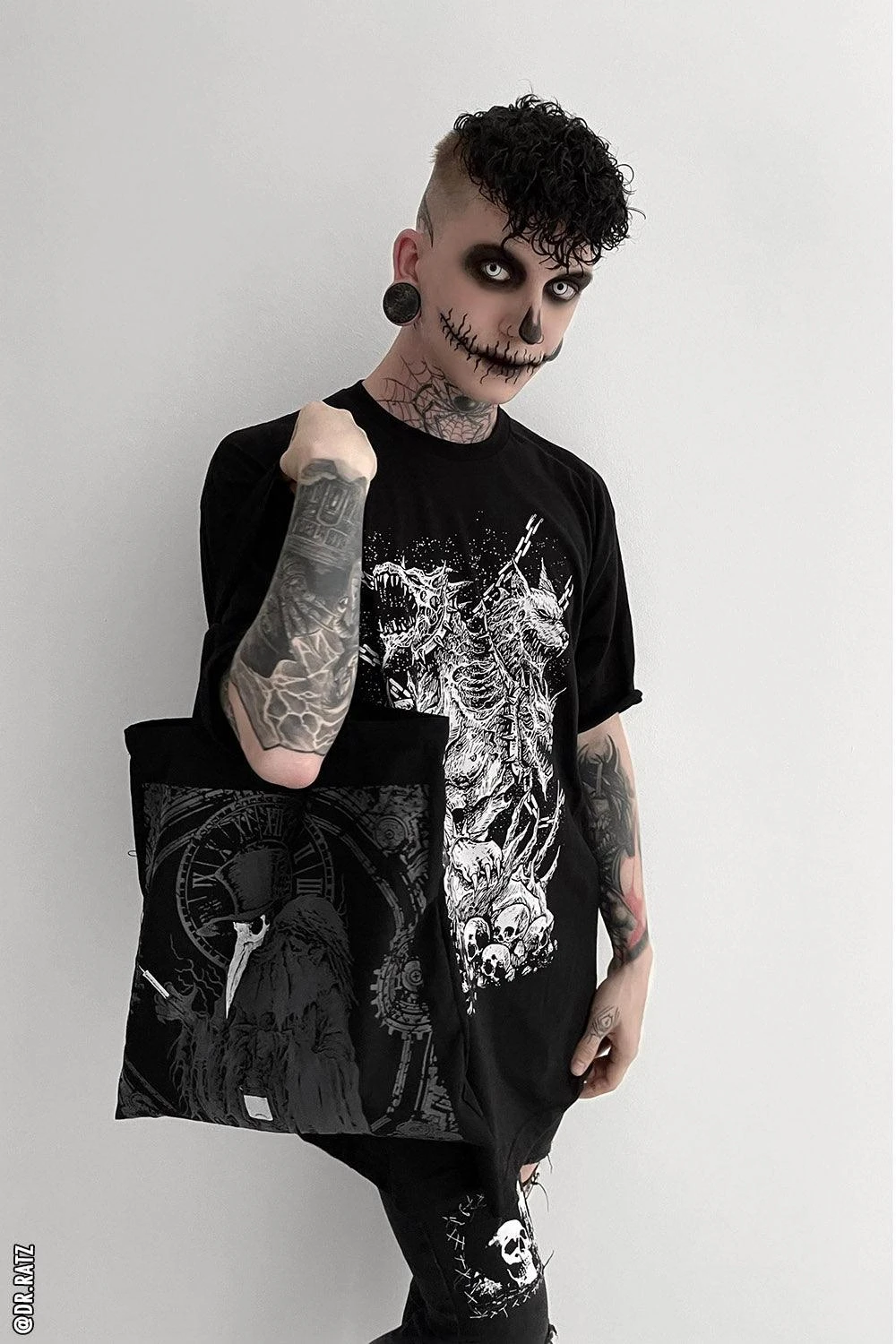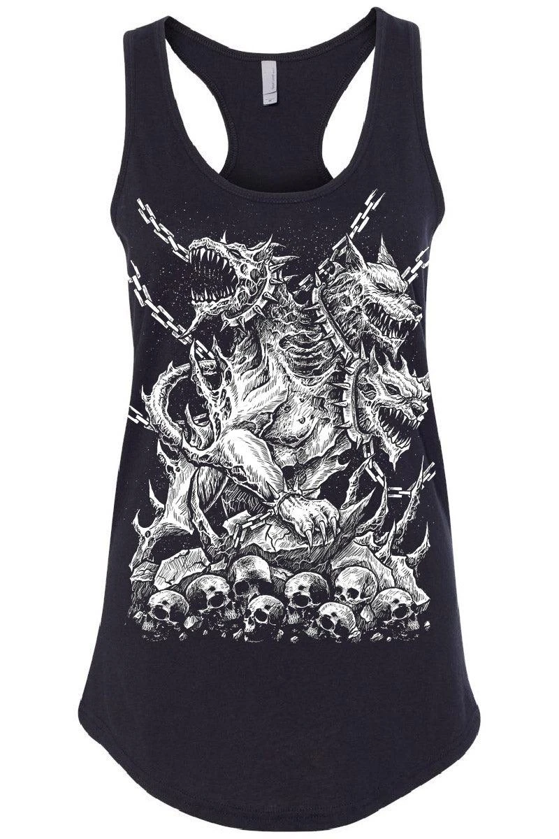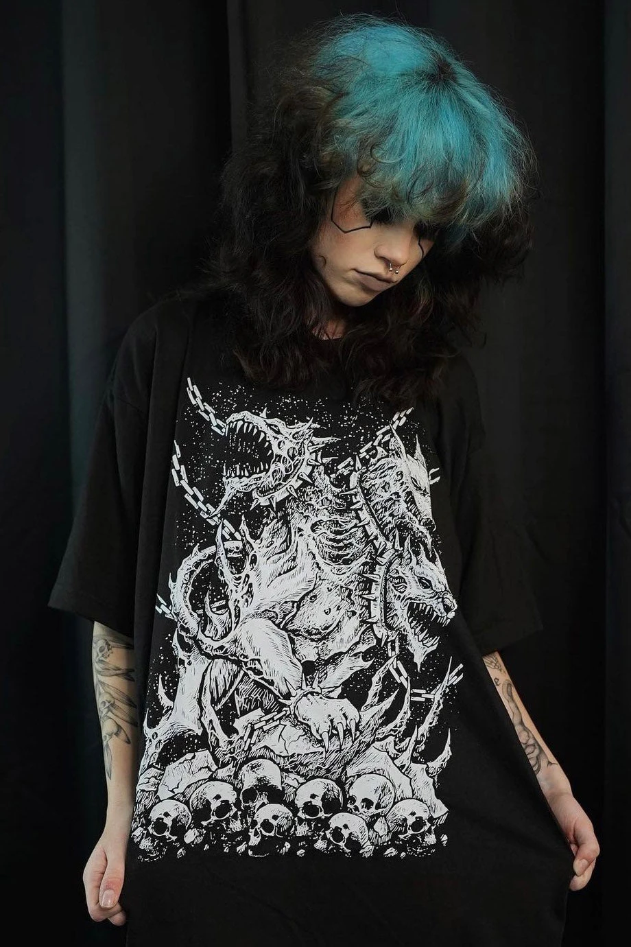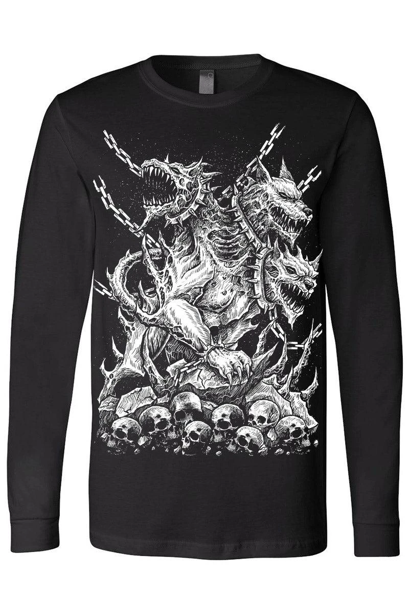 Command the hounds of hell in this epic Cerberus tee! Guard your heathen heart with the three-headed dogs of Hades, confined in chains above a grave of human skulls. Sinfully soft, this gothic shirt is spun from a quality cotton blend designed to keep you comfy & creepy when you take your goth dog for a walk.Â