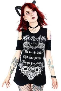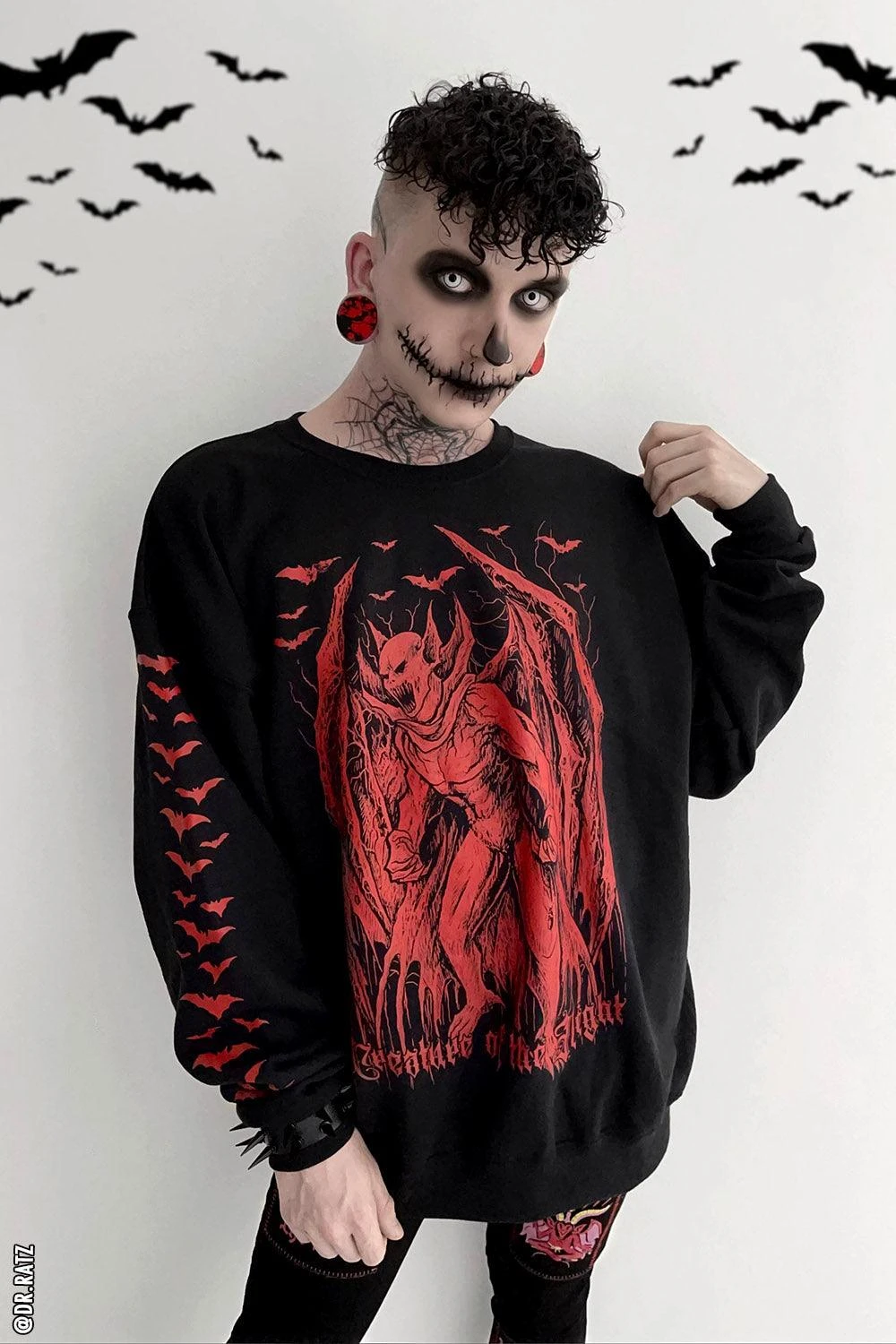 Sink your fangs into this chilling sweatshirt, hand-printed and hexed for the living dead. Make your bloodthirst known in the heavy metal graphic, depicting a ravenous vampire woken by the consuming need to feed. Creature of the Night haunts the sinfully cozy cotton blend in blood-red, gothic font. A cauldron of bats flutters up the long sleeves to please your cold, dead heart. Finished with VampireFreaks branding on the back to make mortals beware.