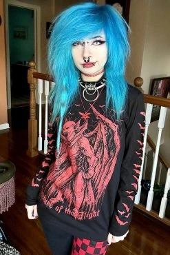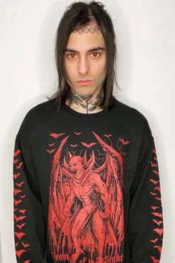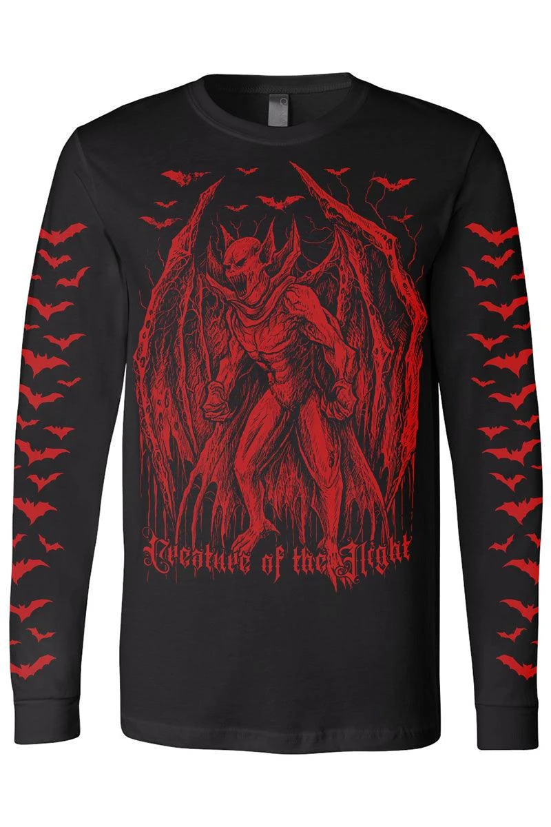Sink your fangs into this chilling shirt, hand-printed and hexed for the living dead. Make your bloodthirst known in the heavy metal graphic, depicting a ravenous vampire woken from his slumber by the consuming need to feed. Creature of the Night haunts the sinfully cozy cotton blend in blood-red, gothic font. A cauldron of bats flutters up the long sleeves to please your cold, dead heart. Finished with VampireFreaks branding on the back to make mortals beware.