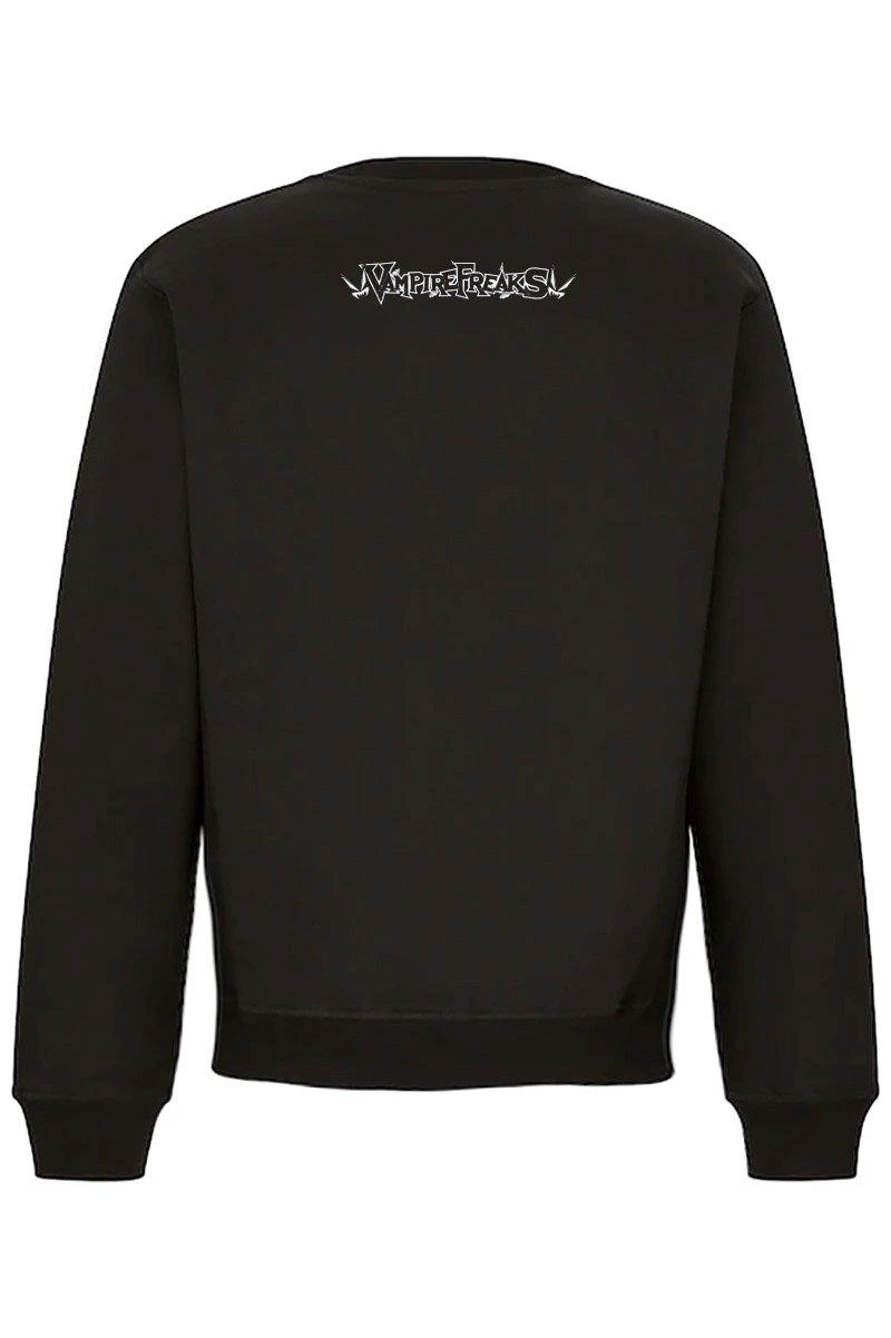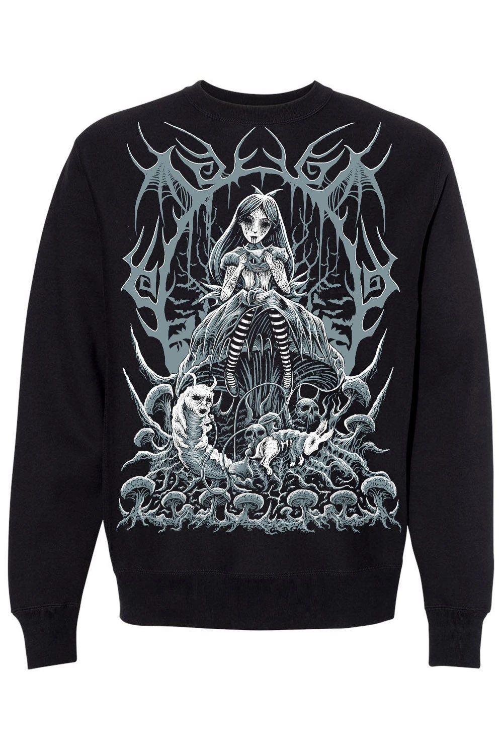 In this exclusive VampireFreaks design, Alice sits atop a morbidly magical mushroom, swinging her stripy stockings above a gory garden of skulls, rancid roots, and a cadaverous caterpillar. Stroking the decapitated head of the Cheshire Cat, the dearly departed pussycat’s entrails leak into Alice’s lap. Enveloped in a cameo of vines, bats, and severed wings, Alice watches over Wonderland with her black, soulless eyes.