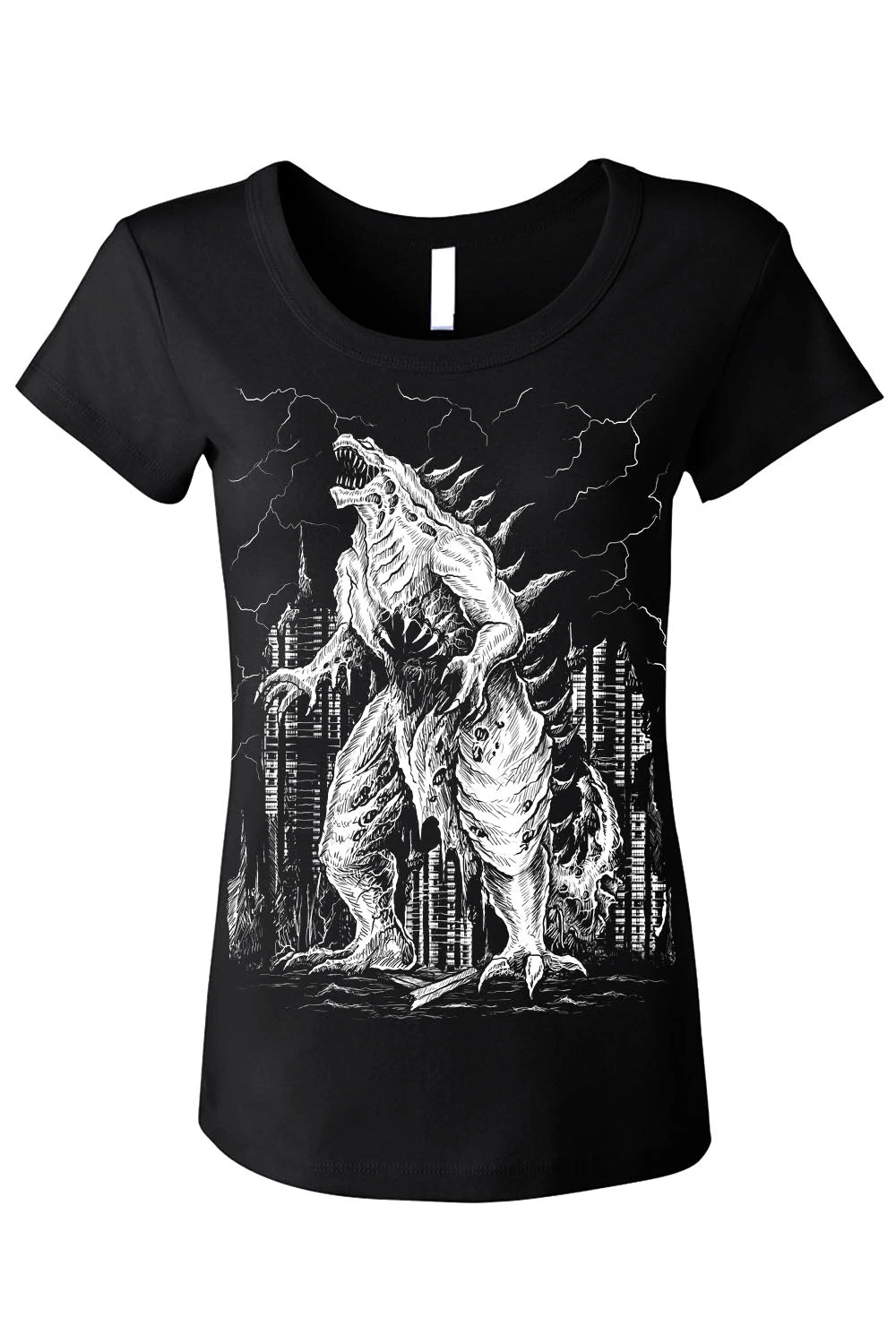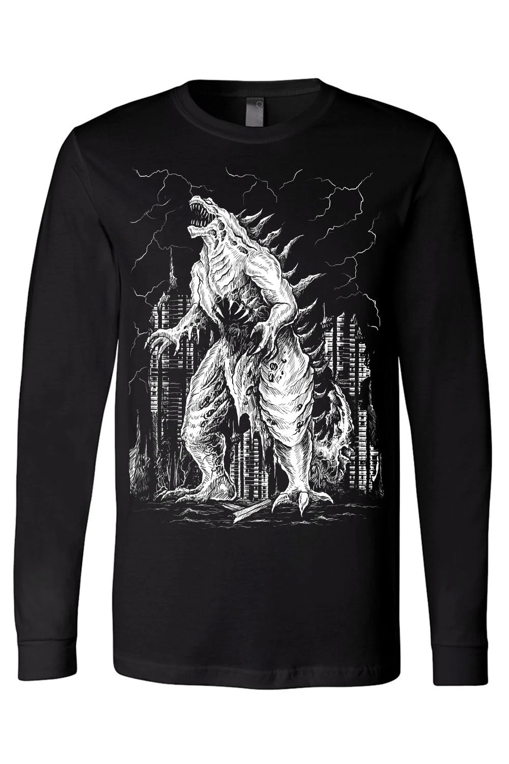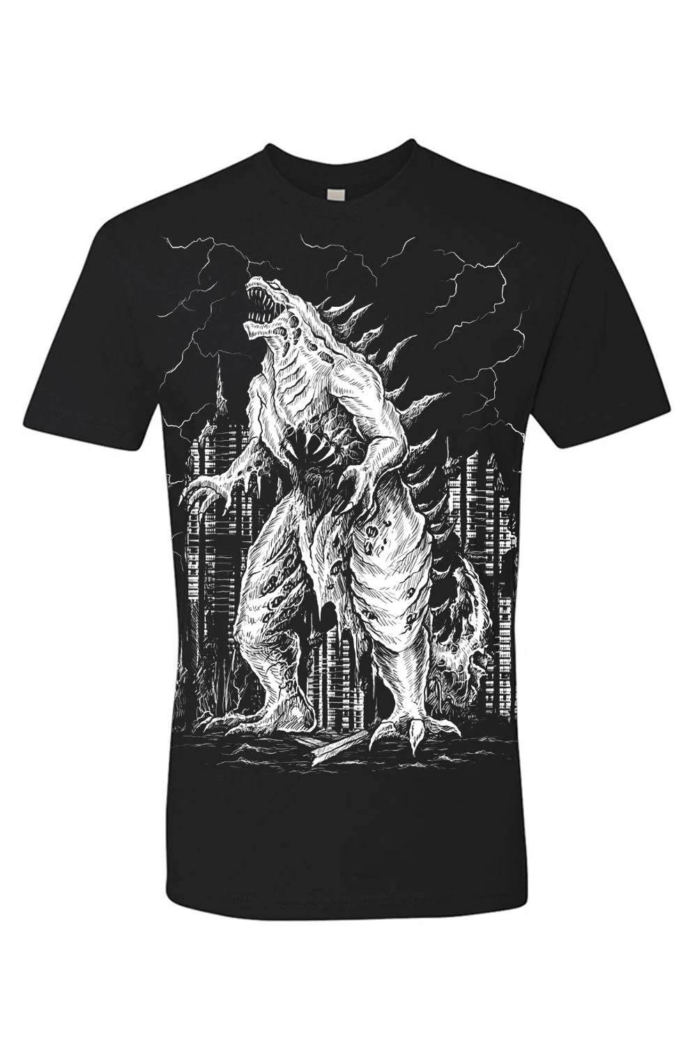 Unleash your inner beast in this hella hardcore Gothzilla tee! Haunt the streets with the heavy metal design, featuring the king of the monsters wrecking revenge on a demolished city. Lightning strikes the pitch-black sky as Gothzilla screams into the toxic air. Razor-sharp claws and talons jet from his body, as a vacuous hole surrounded by spikes consumes everything in the monster’s wake. Perfect for horror addicts and those more monster than man.
