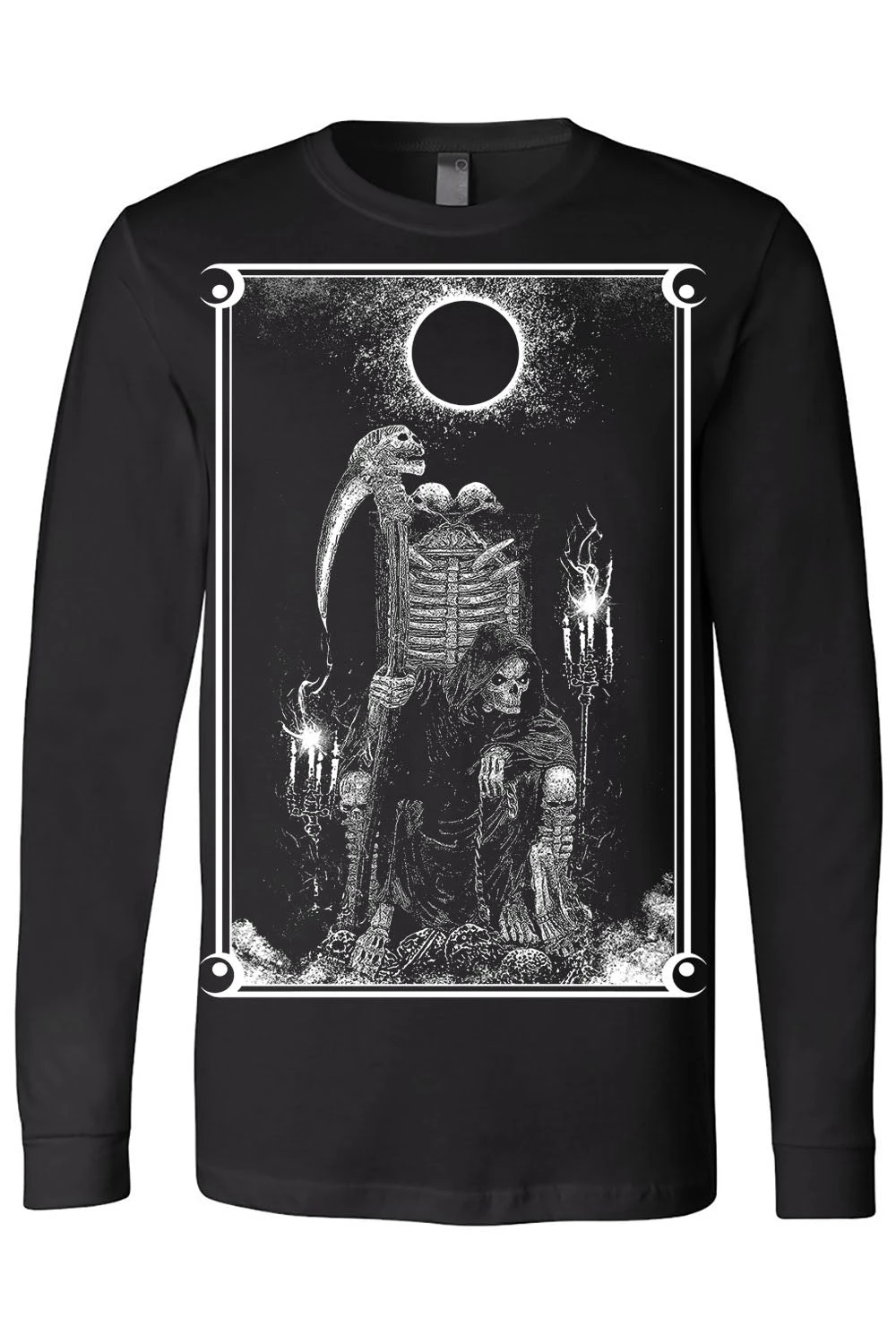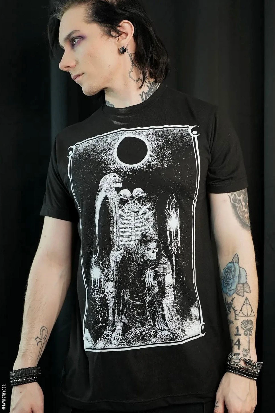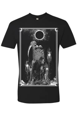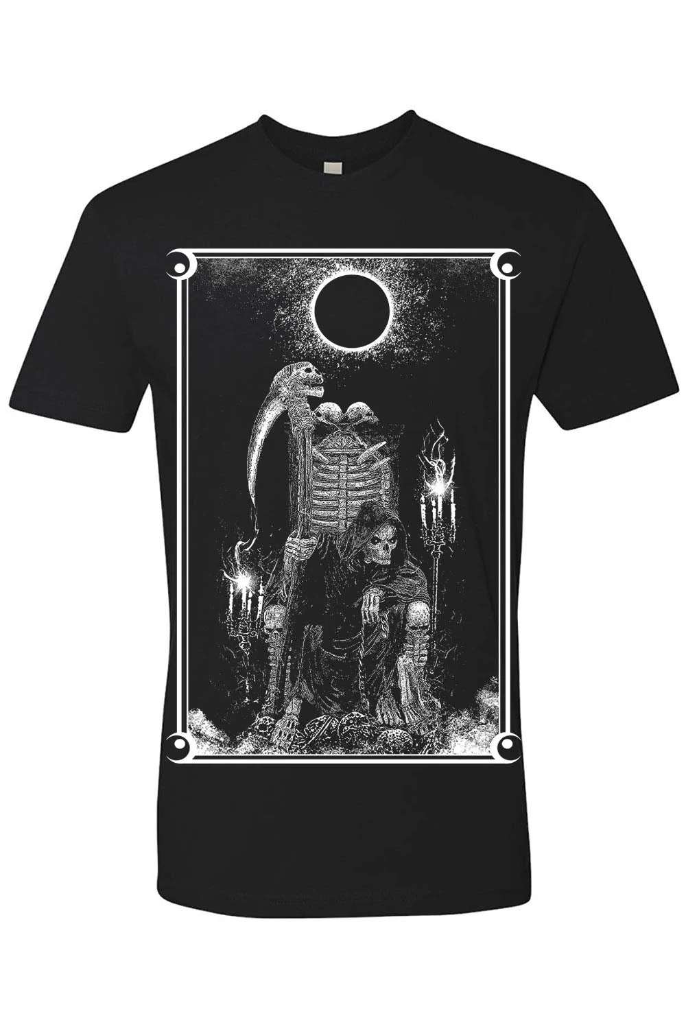 Pay homage to the harbinger of death in this gravely gothic shirt! The Grim Reaper sits on a throne of human bone, ruling over his domain of the damned. Candles flicker on the Reaper’s scythe, made from the remains of his prisoners. A black moon rises above in the forever-night sky… for in the underworld, darkness reigns. Â