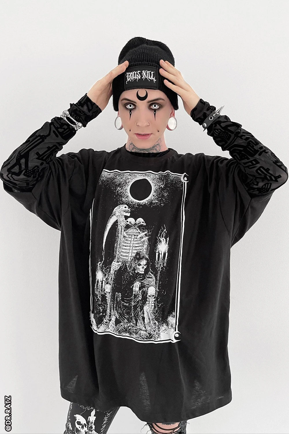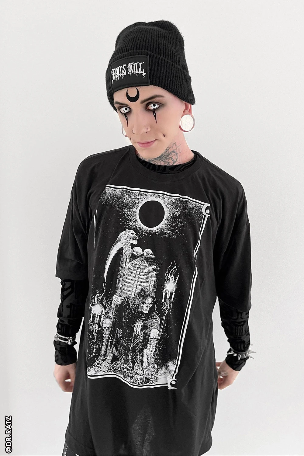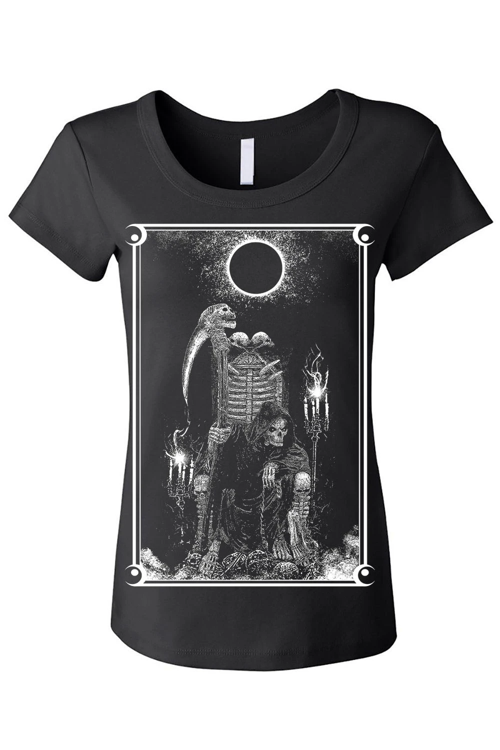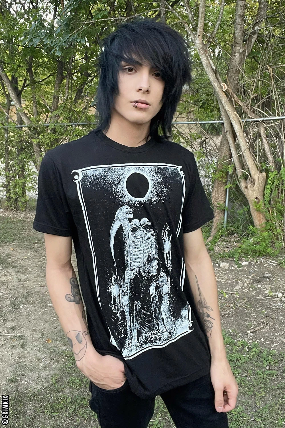 Pay homage to the harbinger of death in this gravely gothic shirt! The Grim Reaper sits on a throne of human bone, ruling over his domain of the damned. Candles flicker on the Reaper’s scythe, made from the remains of his prisoners. A black moon rises above in the forever-night sky… for in the underworld, darkness reigns. Â