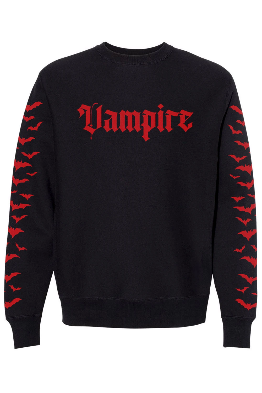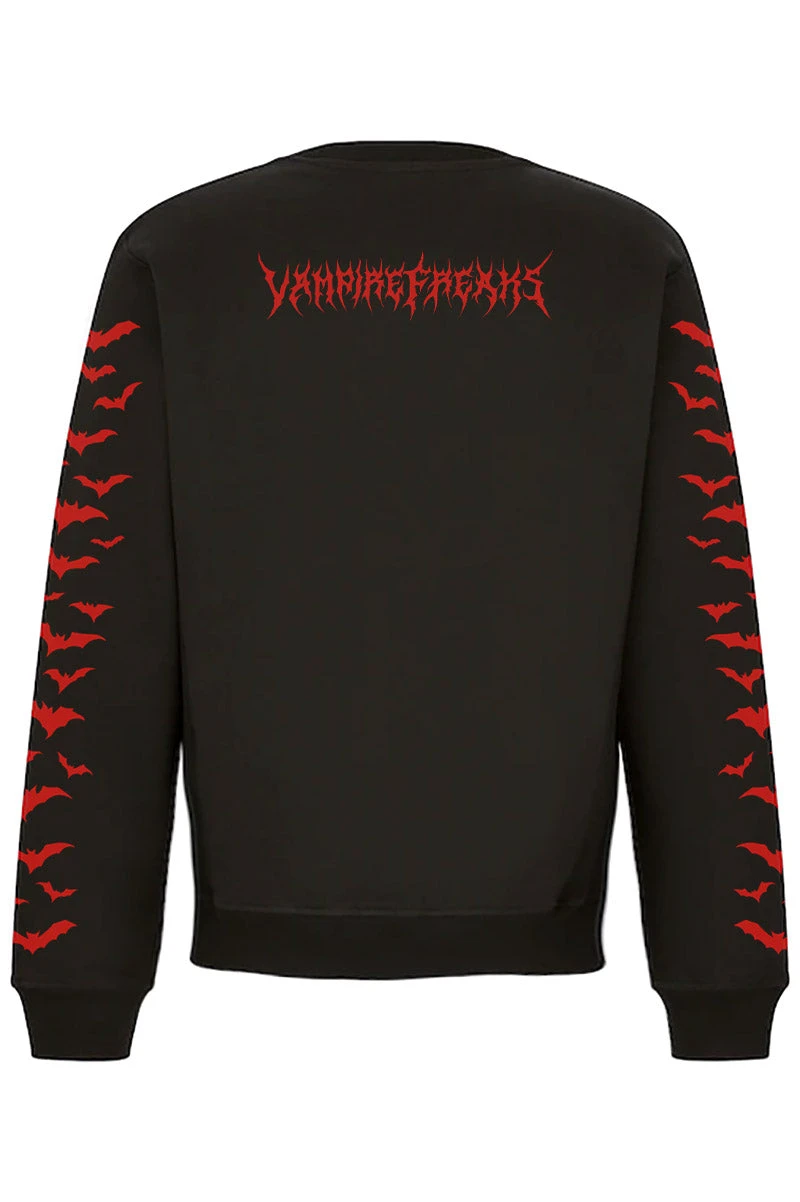 Make your bloodthirst known wearing this statement sweatshirt, hand-printed and hexed for creatures of the night. Vampire is printed on sinfully cozy cotton in blood-red, gothic font. A cauldron of bats flutters up the sleeves to please your cold, dead heart. Finished with VampireFreaks branding on the back to make mortals beware.