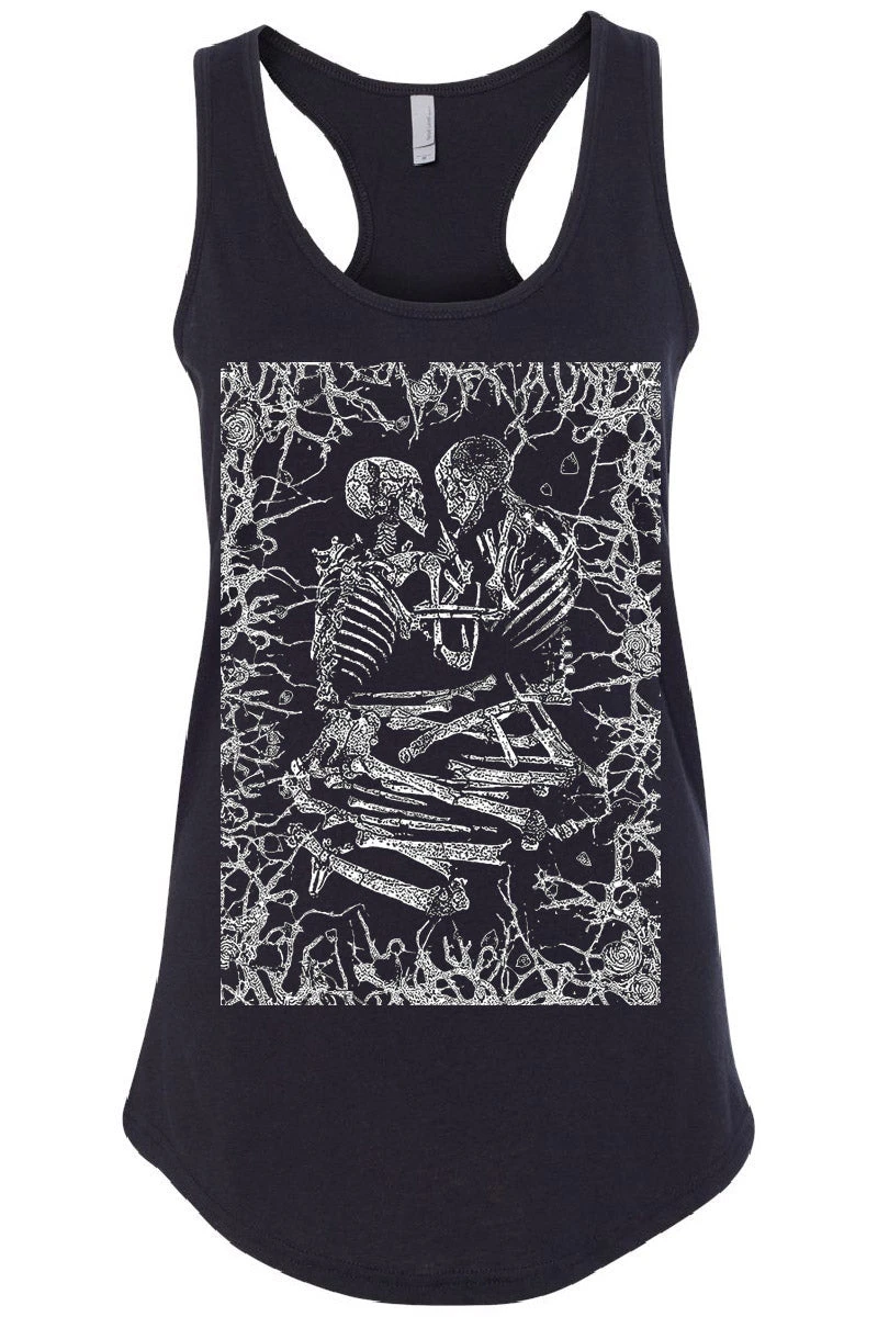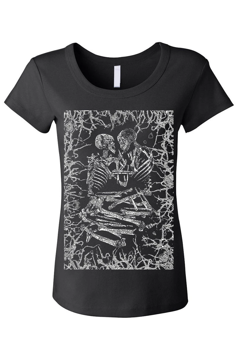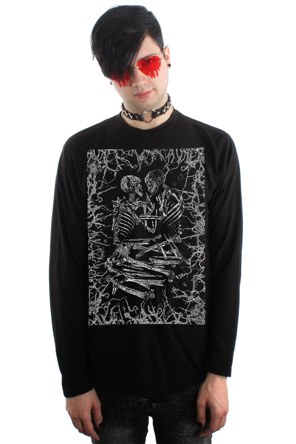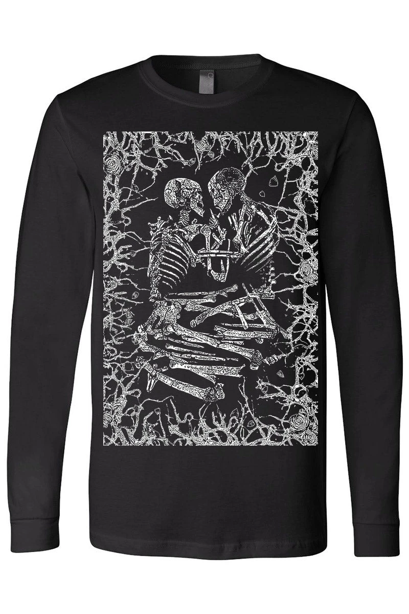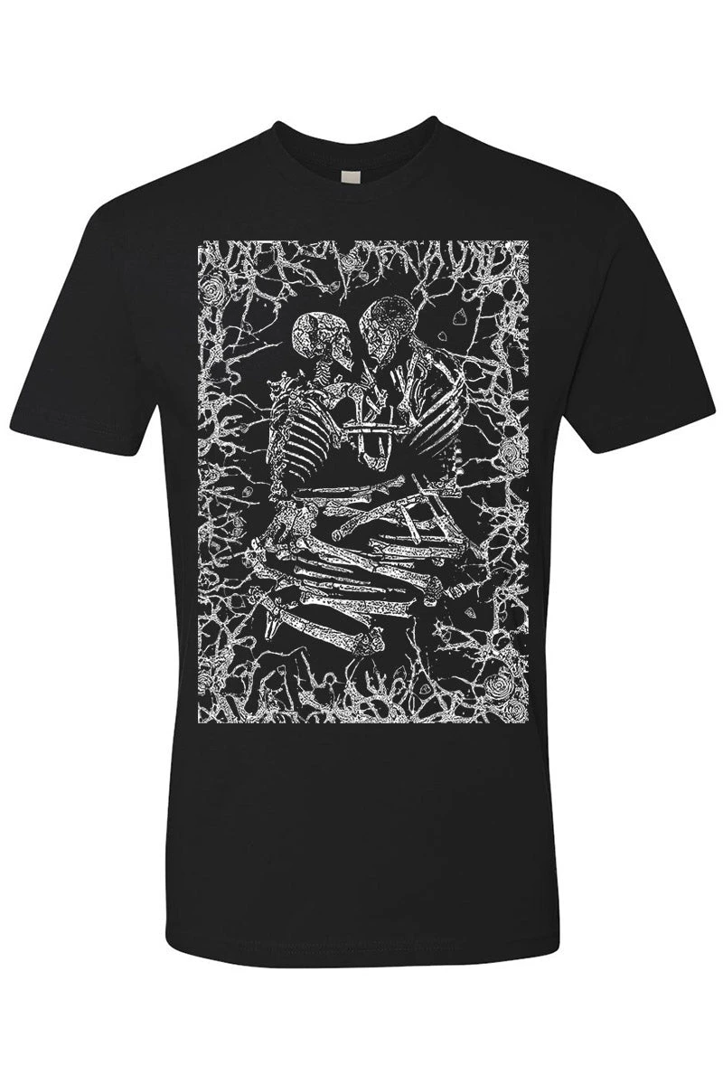 Never let love die in this haunting tee, featuring two skeleton lovers lying in a forgotten tomb overgrown with thorns & roses. Stay cozy and creepy in the soft cotton construct, designed to bring some gothic romance to your goth clothes. Featuring the Valdarro Lovers—a pair of human skeletons over 6,000 years old who died in death’s eternal embrace. Â