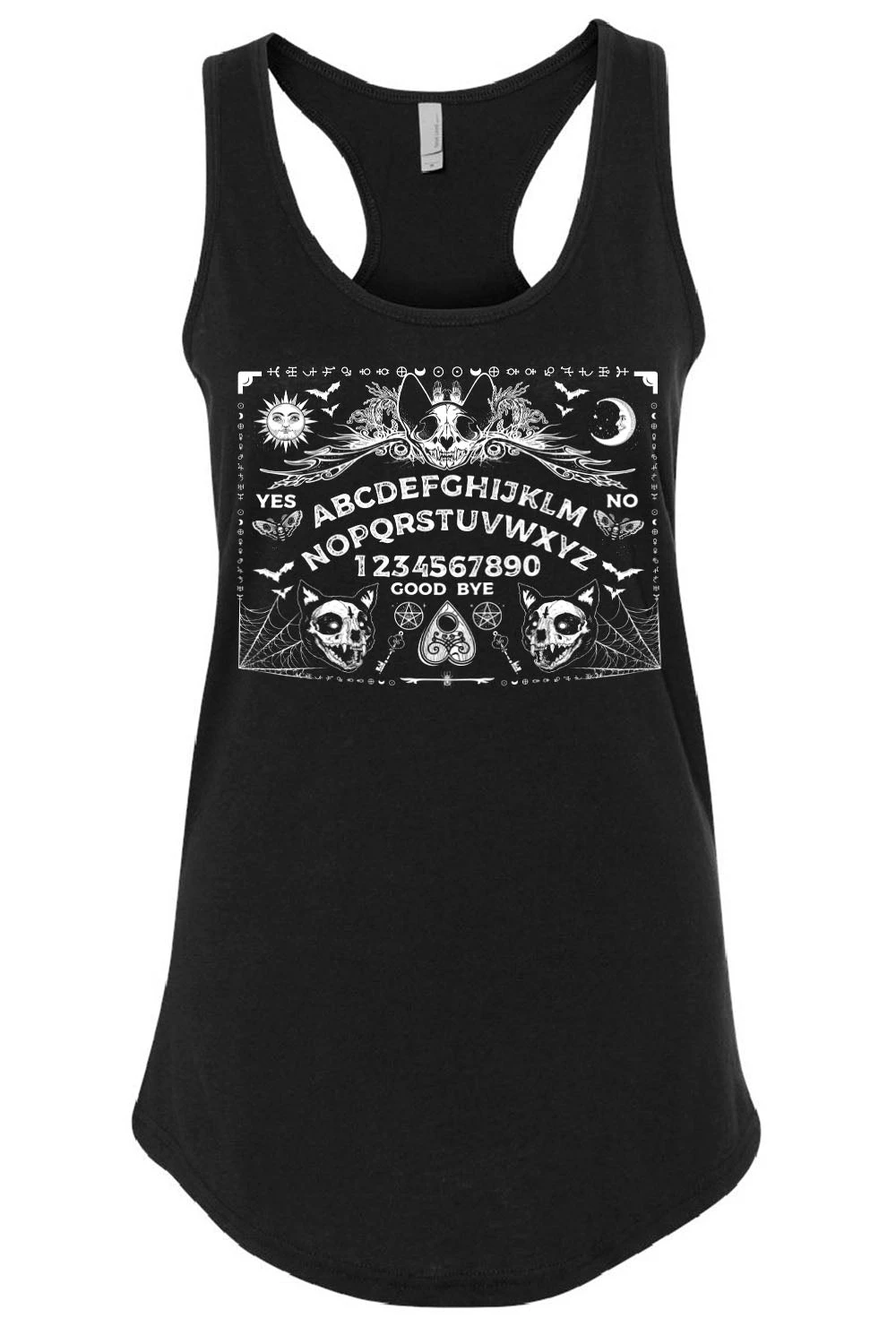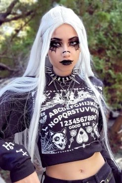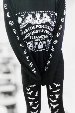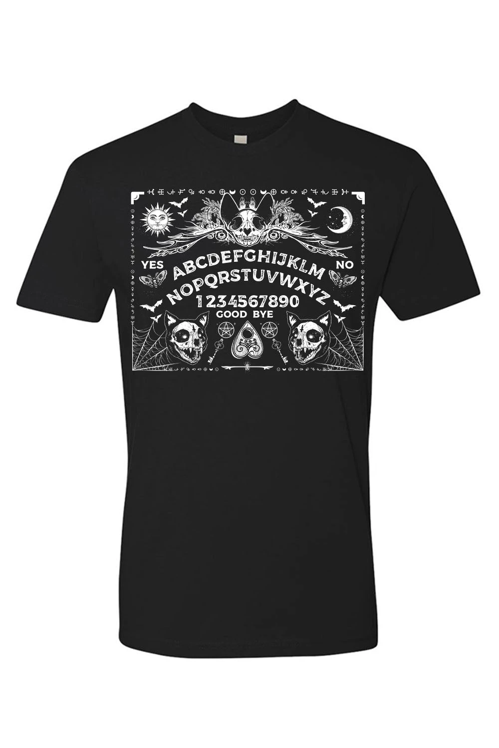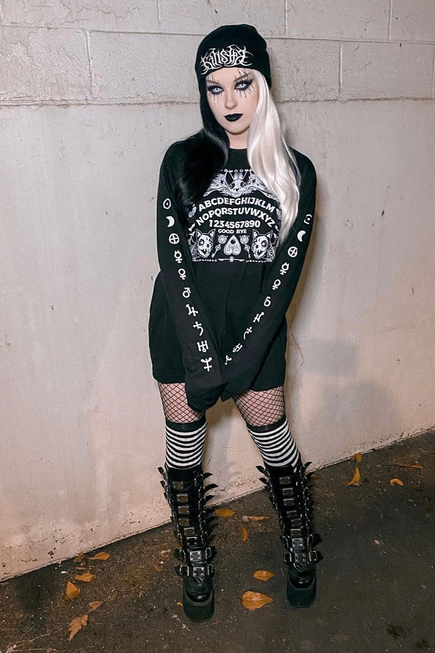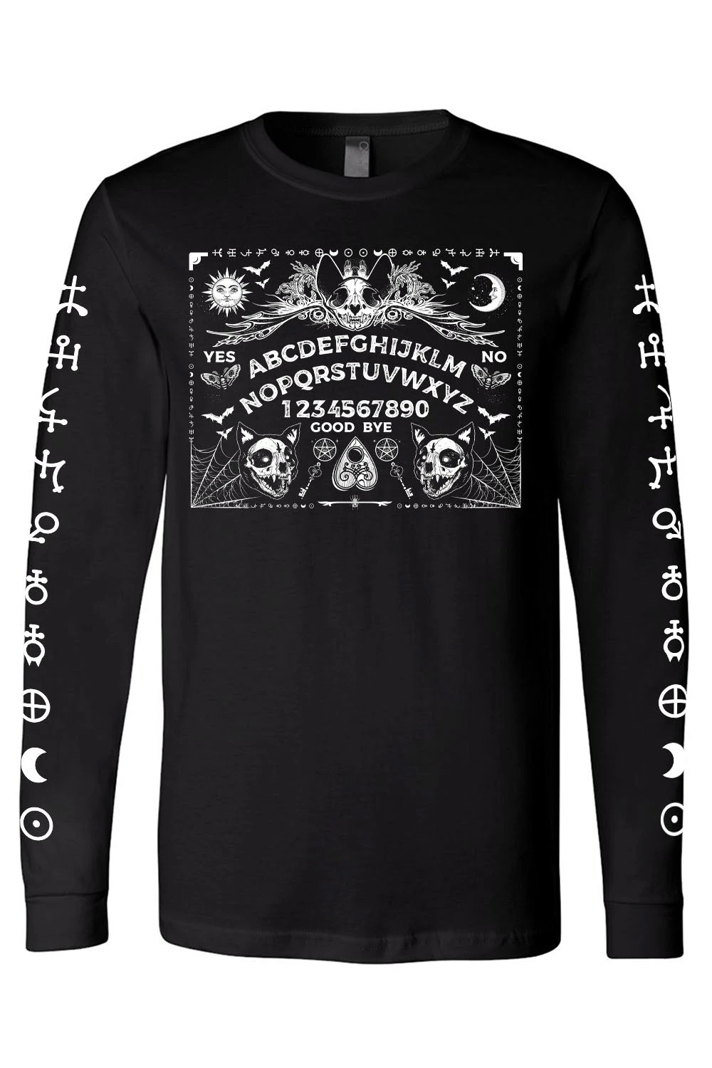Conjure purranormal activity in this spooky spirit board shirt! Features a mystical ouija board possessed with cat skulls, cobwebs, moths, bats, pentagrams, and more! Summon scares with the ghostly-white occult symbols down the long tee sleeves. Constructed of quality cotton to keep you comfy + creepy.