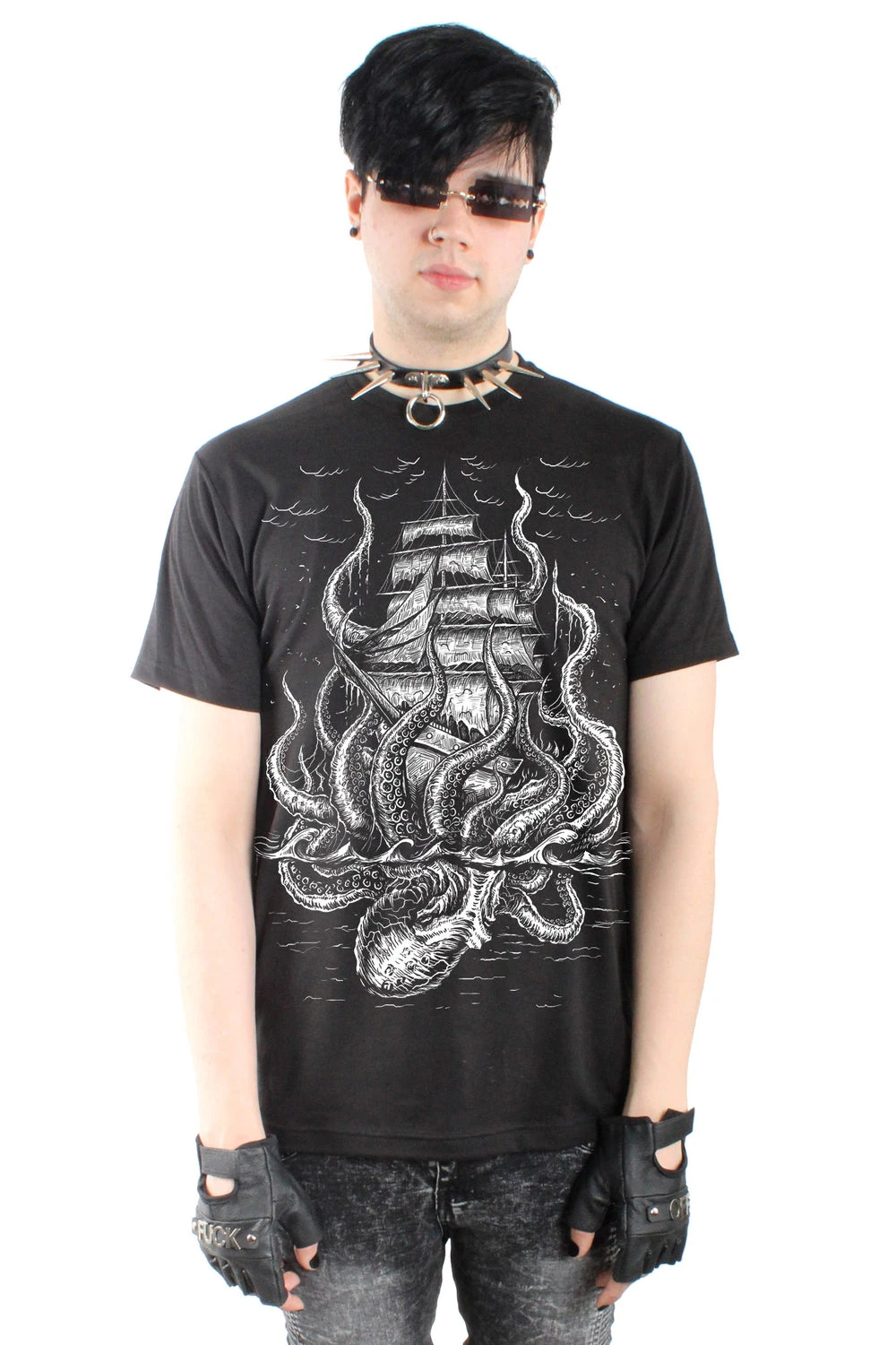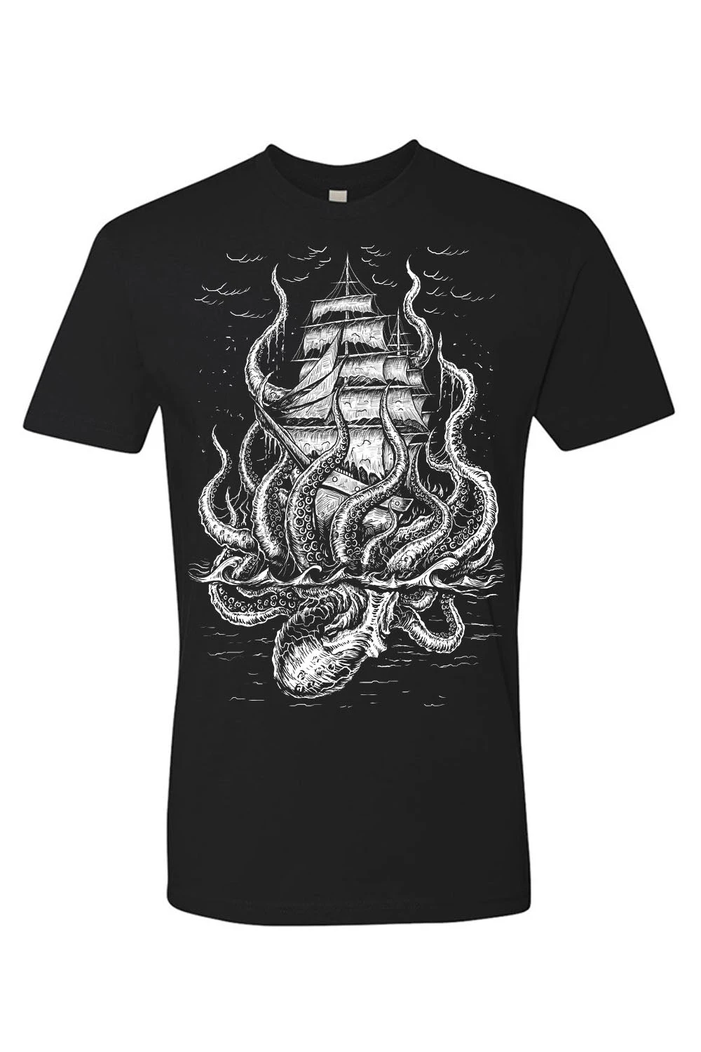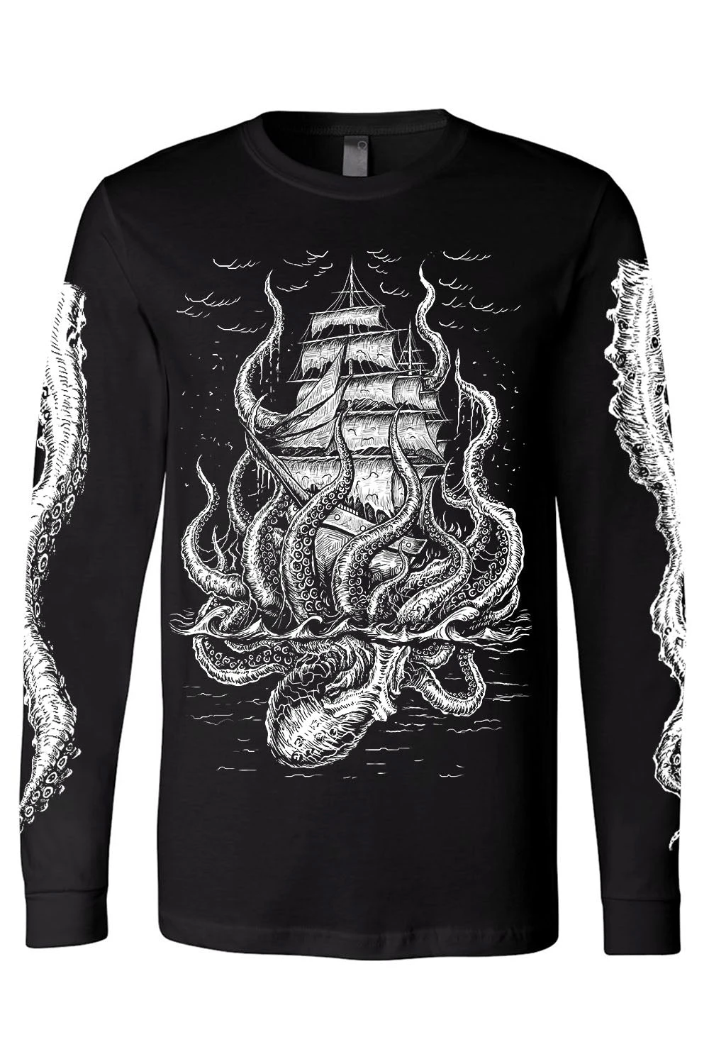 Invoke monsters of the deep with this killer Kraken shirt! A pirate ship under the Kraken’s attack haunts the front—octopus tentacles possess the long sleeves. Make dark waves in the criminally cozy construct, made of sinfully soft cotton! The Kraken takes no prisoners…. and neither do you.