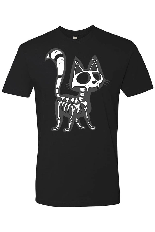 Conjure some cat power with this bundle of bones on your tee! With big empty eyes, fiendish fangs, and bones all about, this creepy cat is dyying to add some spook to yer look. Constructed of premium poly cotton, this gothic t-shirt is designed to keep you comfy and cool when you leave the crypt. No bones about it, yer pawsitively purrfect in the Skelekitty Tee!
