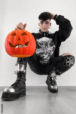 Ride into the dead of night in this chilling fantasy sweatshirt! Treat every day like Halloween in the heavy metal design, featuring the Headless Horseman riding his infernal horse and hoisting his disembodied pumpkin head. The Legend of Sleepy Hollow haunts the cemetery of jack-o-lanterns in fiendish font below, paying homage to Tim Burton’s horror movie masterpiece.